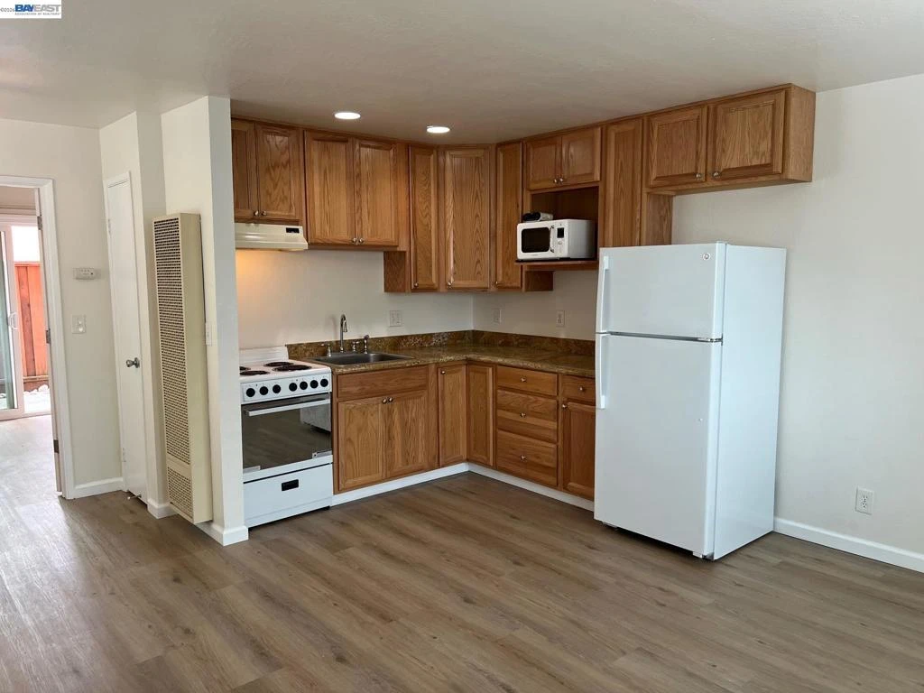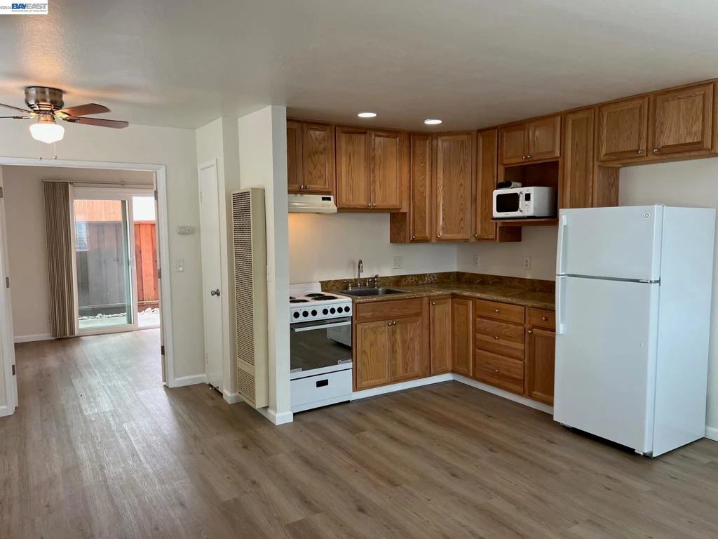 Updated One Bedroom Apartment in Pleasanton's Vintage Hills! Sunny, first floor unit, kitchen/living area with plank floors, ample kitchen cabinets, granite counters, dining area with lighted ceiling fan, double door access to bedroom suite featuring, bathroom with granite counter, large walk-in closer, slider access to private patio. One covered parking space. Water & Garbage included in the rent. On-site laundry. Walking distance to shopping, dining, services and community parks.