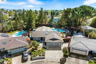 Nestled on an expansive .43-acre lot at the end of a quiet court, this exceptional North-facing single-level home offers an incredibly rare combination of space, flexibility, & resort-style outdoor living in one of Pleasanton’s most desirable settings. Thoughtfully designed with comfort & versatility in mind, the home features a well-separated bedroom layout, making it ideal for multigenerational living or dual-family arrangements. Multiple living spaces provide room for everyone to gather or spread out, including a welcoming living room & two spacious family rooms, perfect for entertaining, relaxing, or creating dedicated work & recreation areas. At the heart of the home is a gourmet kitchen, designed for both everyday living & hosting, with generous quartz counter space & seamless flow into the open living areas. Step outside to experience a truly spectacular backyard retreat, featuring a sparkling pool perfect for cooling off on warm Pleasanton days or hosting unforgettable summer gatherings. The beautifully landscaped grounds offer lush, low-water gardens & an abundance of open space rarely found in Pleasanton. Whether hosting large gatherings, poolside parties, or enjoying quiet evenings under the stars, this property provides the perfect setting for exceptional living.