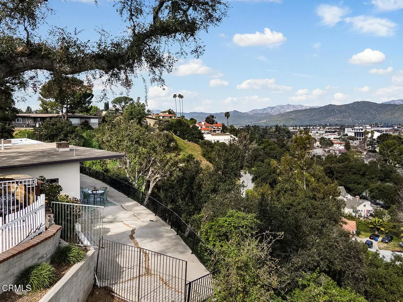 Views! Perched in Pomona's desirable Ganesha Hills neighborhood, this gorgeous Mid Century Modern home is sited on an expansive, scenic lot. Surrounded by mature oak trees, the property offers privacy and sweeping, unobstructed views of the city and the San Gabriel Mountains. Just minutes from downtown Pomona, the Claremont Colleges, and the 10 Freeway, the location combines scenic foothills living with convenient access to nearby amenities. Inside, classic mid century architectural elements define the open plan. Tongue and groove ceilings span the living areas, complemented by exposed wooden beams and concrete floors. Walls of glass with clerestory windows above invite natural light while framing the panoramic views. A formal entry finished with terrazzo tiled floors reflects the home's original architectural character. The open concept layout allows the living and dining areas to flow seamlessly, oriented toward the views and anchored by a stone, wood burning fireplace. A Nelson Bubble Pendant fixture highlights the living room, reinforcing the home's iconic mid century aesthetic, while the kitchen retains original cabinetry, built-in storage, warm toned finishes, and a Lightolier Ribbon Chandelier, giving the home a timeless and historic feel. The primary bedroom includes a walk-in closet with custom doors, and the bath has been updated with terrazzo tiled floors, double sinks, custom cabinetry, a walk-in shower, and refined wall finishes. A spacious basement provides flexible additional space that may be used for storage, office space, or future customization. Outside, the exterior showcases classic board and batten siding. A private driveway leads to a generous lot with a dedicated gardening area along the side of the property. A balcony stretching over 100 feet offers sweeping 220-degree views of Mount Baldy, San Jacinto Peak, and the San Gabriel Mountains, creating an ideal setting for relaxing or entertaining. Nearby attractions include Bonelli Park, the Fairplex, and local dining destinations, adding to the appeal of this special setting. This is a rare opportunity to own a classic Mid Century Modern estate in a highly desirable neighborhood, with sweeping views and a convenient location.