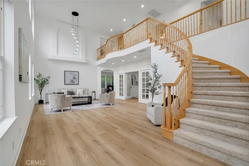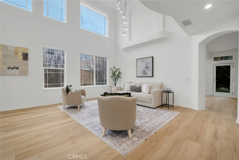 Set within the prestigious, gated Villagio Estates in Porter Ranch, this beautifully maintained two-story 4 bed, 4 bath + den residence offers an exceptional blend of refined living, thoughtful updates, and the security and exclusivity of a controlled-access community. Spanning approximately 3,300 square feet, the home reflects a high level of care and pride of ownership, with attractive architecture, stacked stone accents, and a welcoming formal entry that immediately conveys quality and sophistication. Step into soaring two-story ceilings, abundant natural light from clerestory windows, and striking new lighting fixtures that highlights the openness of the formal living/dining space. Fresh paint, new flooring throughout the house, newly remodeled kitchen, new bathroom fittings, lighting fixtures, door hardware, kitchen appliances and so much more! The home’s thoughtful upgrades and high-end finishes reflect meticulous care and pride of ownership throughout. French doors open to a private office or den with a plantation shuttered passthrough to the adjacent family room, which could be converted to act as an additional bedroom if desired. The inviting informal living space has a cozy, raised-hearth fireplace and seamlessly flows into the stunning kitchen. Beautifully appointed with two tone shaker cabinets, white quartz countertops, marble backsplash, brand-new stainless-steel appliances, and convenient central island. The adjoining, sunny breakfast nook has both breakfast bar seating and room for informal dining surrounded by windows. Upstairs, the generous bedroom layout includes well-sized bedrooms, a full Jack-and-Jill bath, a secondary en-suite bedroom with walk-in closet and ¾ bath, and a spacious primary suite featuring vaulted ceilings, French doors to a private balcony with hillside views, dual walk-in closets, and a luxurious en-suite bath with jacuzzi tub, oversized glass shower, dual sinks, and vanity area. The outdoor space offers a wide patio, built-in BBQ, and a decorative pond with smartphone operated waterfall feature, creating a serene setting for entertaining or quiet evenings. Set within a controlled-access community close to shopping, dining, parks, and top-rated schools, this move-in-ready home delivers generous scale, refined finishes, and the confidence of a residence that has been carefully maintained and tastefully designed for comfort, quality, and long-term enjoyment. Don’t miss this one!