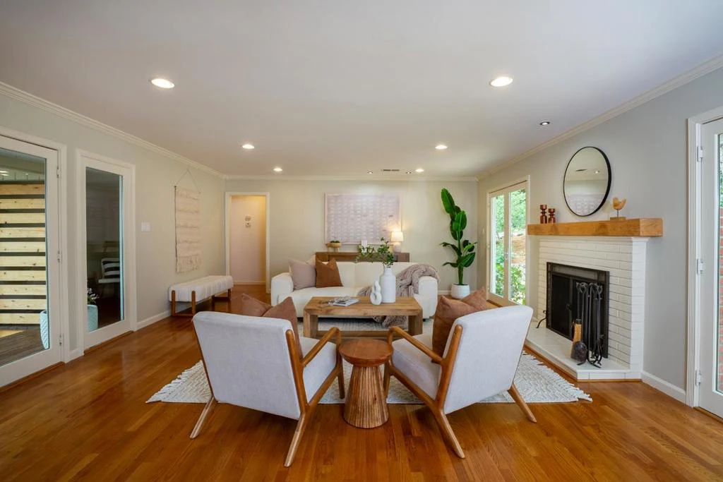 Peaceful Updated Country Living on Nearly 1.5 Acres . Beautifully updated and framed by sun-swept open meadows and majestic trees, this property spans nearly 1.5 acres at the end of a lane. An inviting front porch takes in the tranquil surroundings and sounds of nature. Stepping inside, the ambiance is bright and inviting with refinished hardwood floors, crisp white woodwork, and expansive windows and glass doors. The designer all- white kitchen has Carrara marble counters and stainless steel appliances, including a quality Viking gas range. A separate wing comprises 2 full-size bedrooms and one small bedroom, plus 2 full baths. Perfect for exercise, art, and/or office needs is a detached 2-room studio plus a Nordic-inspired newly added second studio. Tying it all together are many beautiful and versatile outdoor living spaces plus a fully fenced vegetable garden, small orchard, and a chicken coop. Open Houses Sat/Sun 4/11-12 , 1:30pm-4:30pm
