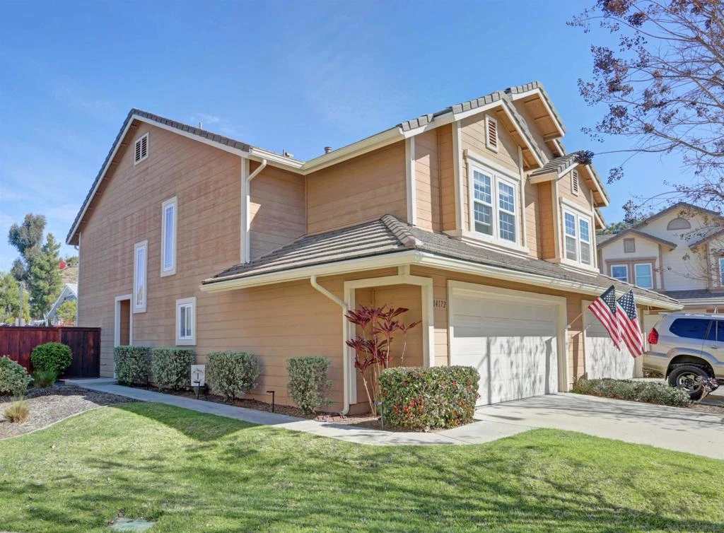 Poway living at its finest!! Delightful twin-home in a prime location of this cul-de-sac neighborhood with views of Twin Peaks and just steps away from Old Poway Park. There is so much to enjoy about this beautifully updated spacious home. The combination family /dining rooms offer delightful views to the entertainers backyard and are warmed by a cozy fireplace. The kitchen boasts s/s appliances, bountiful storage, sit-up counter space and plenty of room for meal preparation. (See Supplement) You'll appreciate the first floor powder room that's perfect for separating family space from entertaining. All three bedrooms are on the second floor.. The Primary bedroom is quite spacious and features a vaulted ceiling, new ceiling fan, and a recently installed custom walk-in closet system. Both ancillary bedrooms are located away from the primary and enjoy beautiful views of the hills to the north. The backyard is tastefully designed to take advantage of both entertaining and relaxation. The stunning pink Bougainvillea provides a beautiful foreground to blue skies and the views of twin peaks. Enjoy sitting around the table just outside the dining room or in the covered outdoor living space across the "ever green" artificial turf. Fruit trees enjoy their own space and the whole scene works beautifully. A short stroll to the Saturday farmers market is a treat as are the many shops and eateries that make Old Poway Park a mecca for the community. This is your Golden Opportunity.....don't let it pass you by.