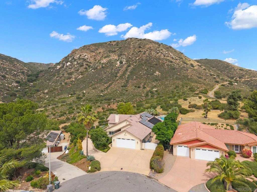 Resort style, single story, custom built home at the end of a private cul-de-sac with mountain views, owned solar with back up batteries in a well established community! 4-bedroom, 3 full bath home plus an office/library off the formal entry hall. Dramatic wood cross-beam ceilings, soaring picture windows with expansive views and a raised-hearth stone fireplace with blower, built-in shelving, and seamless flow to the kitchen and dining areas. Hardwood and tile flooring throughout. Chef inspired kitchen with granite countertops, wine fridge, Bosch fridge, island with sink and two refrigerated drawers, 6-burner gas range, built-in desk, & walk-in pantry. Formal dining room overlooks the outdoor kitchen, large patio, and mountain views. Spacious primary suite with plush carpeting, private covered patio access, and an en-suite bath featuring dual vanities, soaking tub, large walk-in shower, and ample storage. Two secondary bedrooms include built-in desks and share a Jack-and-Jill bath. Guest bedroom sits near a full hall bath with access to the laundry room with extra cabinetry and counter space. Enjoy the private solar-heated pool and spa, outdoor kitchen with Viking gas grill & cooktop, sink, skylit wood ceiling and multiple view terraces and entertaining patios. Outdoor spaces include a front-facing terrace off the great room, grass area below the pool, and a private pool terrace with storage shed, elevated waterfall spa, and wraparound patios ideal for stargazing. Gated side driveway offers RV parking and RV hookups and storage. Mature landscaping includes apricot, plum, Meyer lemon, Bearss lime, navel orange, bay laurel, key lime, Mexican lime, and chardonnay grapevines. Additional features: whole house filtration system, new AC, ceiling fans, skylights, dual-pane windows, owned solar with 3 back up batteries. Located within San Diego Country Estates, a master-planned community known for its resort-style amenities and scenic backcountry setting. Residents enjoy access to an award-winning golf course, equestrian centers, pools, parks, and miles of hiking, biking, and riding trails, along with a strong sense of community and year-round events.