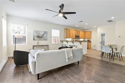Welcome to this beautifully updated family home offering space, style, and comfort throughout! Featuring 4 bedrooms and 3 full bathrooms, this residence boasts a wide-open floor plan perfect for modern living and entertaining. Enjoy the seamless flow between the dining area, family room, and kitchen—creating a bright and inviting central gathering space. The remodeled kitchen is a true highlight, showcasing granite countertops, stainless steel appliances, and a convenient breakfast counter ideal for casual dining or morning coffee. All bathrooms have been tastefully updated, while brand new high-end laminate flooring and plush new carpet add warmth and sophistication. Fresh professional two-tone interior and exterior paint provide a crisp, move-in-ready feel. The versatile layout includes one bedroom and a full bath downstairs—perfect for guests or multi-generational living—along with a convenient indoor laundry room. Upstairs, you'll find a spacious loft offering endless possibilities for a home office, media room, or play area. The large primary suite serves as a relaxing retreat with plenty of room to unwind. Step outside to a generously sized backyard designed for summer enjoyment, complete with a sparkling pool and jacuzzi. The landscaped front yard enhances curb appeal, while RV access and a 2-car direct access garage add everyday convenience. This home truly has it all—don’t miss your opportunity to make it yours!