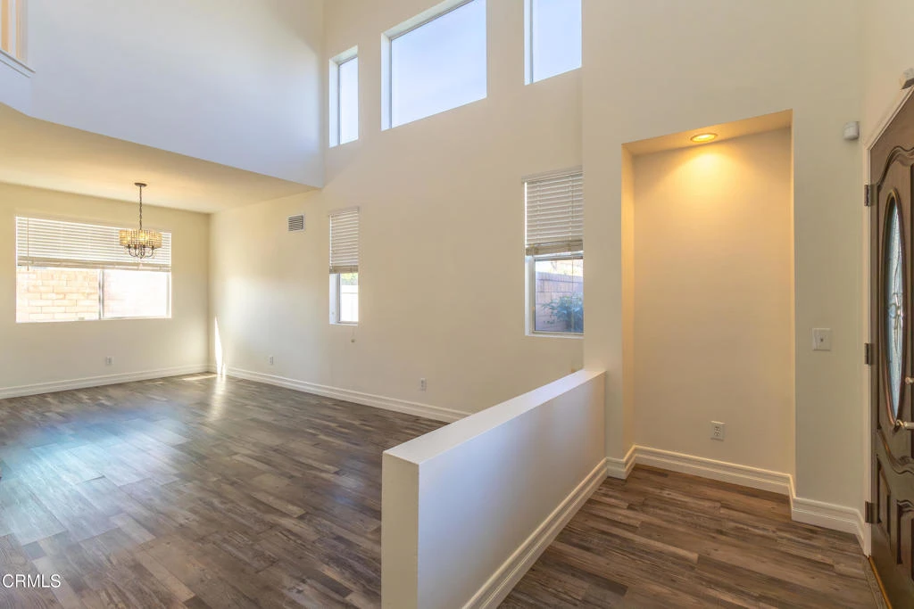 Located on a beautifully maintained street in Rancho Cucamonga, this spacious 2-story home offers comfort, functionality, and a desirable location just moments from Victoria Gardens, top award winning schools, and local parks. A long driveway leads to the home's inviting entry, where vaulted ceilings and wood-like flooring create a bright and open first impression. Just inside, a convenient coat closet sits to the left, while the combined living and dining area features a stylish chandelier and an easy flow for everyday living or entertaining. Off the main entry, a hallway leads to a versatile den or potential bedroom, a 3/4 guest bathroom, and direct access to the attached finished 3-car garage with epoxy flooring and side-by-side laundry hookups. The heart of the home is the open-concept kitchen and family room, complete with recessed lighting, ceiling speakers, wood-louvered shutters, and a sliding glass door that opens to the backyard. The kitchen is equipped with stone countertops, stainless steel appliances, and a diamond-pattern tile backsplash, and connects back to the dining area for a seamless layout. Upstairs, natural light fills the space through clerestory windows overlooking the living area. At the top of the stairs, you'll find a full bathroom with a tub and shower combination, along with a well-sized bedroom featuring a ceiling fan and sliding-door closet. The expansive primary suite offers vaulted ceilings, a walk-in closet, and a private ensuite bathroom with a dual-sink vanity, quartz countertops, a soaking tub, separate shower, and private toilet room. A third bedroom, also with a ceiling fan and sliding-door closet, is located at the opposite end of the hall. The backyard provides two outdoor spaces, a covered patio for shaded relaxation and a separate open patio ideal for entertaining. With its flexible layout, generous living spaces, and prime location near shopping, dining, and recreation, this Rancho Cucamonga lease offers both comfort and convenience.