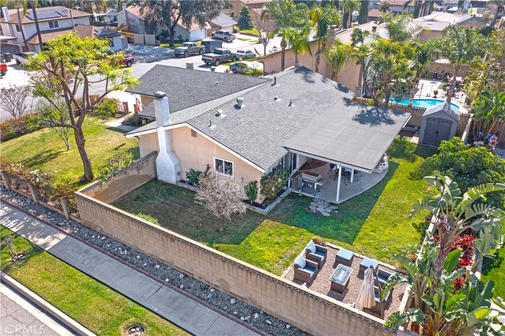 Situated on a desirable corner lot at the top of a quiet cul-de-sac, this beautifully maintained family home offers privacy, efficiency, and exceptional curb appeal. The property is surrounded by wrought iron and block wall fencing and features a fully gated front yard for added security and peace of mind. Step inside to a warm and inviting living room featuring rich wood flooring, elegant plantation shutters throughout, and a cozy fireplace that creates the perfect gathering space. The dining area flows seamlessly to the backyard patio through dual-pane sliding glass doors, creating the perfect setting for effortless indoor-outdoor entertaining. The kitchen offers abundant counter space, recessed lighting, and a newer dishwasher purchased last year — providing both functionality and convenience. Both bathrooms showcase custom neutral tile finishes for a timeless, cohesive look. Major improvements include dual-pane windows and sliding doors, an updated HVAC system, and a newer roof. The air conditioning system is rated for a larger square footage home, allowing for highly efficient cooling and optimal comfort year-round. Ceiling fans in every room and on the covered patio further enhance energy efficiency and airflow. The flat, well-maintained backyard is designed for both relaxation and entertaining, complete with automatic sprinklers, California native landscaping, mature fruit trees, and stunning mountain views directly from the yard. The covered patio provides a beautiful scenic backdrop for gatherings or peaceful evenings at home. Located in a highly desirable, family-friendly neighborhood close to shopping, schools, parks, and entertainment, this Alta Loma home offers exceptional value with numerous tasteful upgrades throughout — a true pride-of-ownership property.