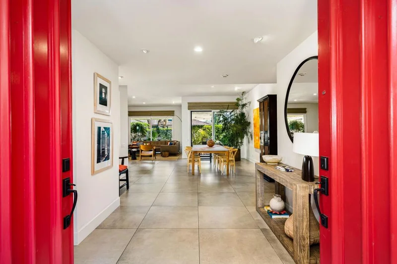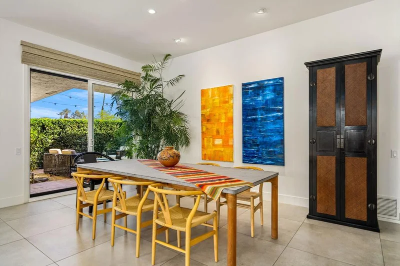 Step inside this gorgeous Springs Country Club home and be transported to a private retreat. Reminiscent of an Italian villa, this residence offers the finest amenities and a contemporary, artsy feel with high ceilings and total privacy. The home features a grand entry and a formal dining space large enough for nearly any size table. The lovely living area includes a beautiful modern fireplace and ample wall space to display your art. This early-built Medinah model is further elevated by large 32x32'' modern gray porcelain tile throughout. The functional kitchen is equipped with stainless steel Bosch appliances, open shelving, and a serene eating area with views of the lush greenery. Designed for entertaining, the secluded kitchen space keeps the prep area tucked away from your guests' view while offering glimpses of the private pool. The primary suite serves as a private resort, featuring a soaker tub, a Toto toilet, and a rare, custom-carved wood double vanity. A vintage door serves as a unique room divider, and the space is surrounded by windows that bathe the room in natural light. The secondary en-suite bedroom also offers a private outdoor space, generous light, and plenty of room for a king-sized bed. Additionally, the third bedroom has been transformed into an office or den with built-in cabinetry and a cozy fireplace. The property is equipped with a leased solar system with only eight years remaining. Residents can enjoy all the club has to offer, including golf on our new $16M fully renovated golf course, pickleball & tennis courts, bocce ball, a gym, and various social events. The home is centrally located near shopping, dining, and entertainment at The River and famous El Paseo.
