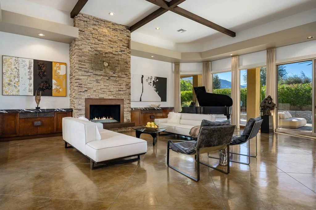 Soaring mountain views in this beautifully finished contemporary home that feels like a peaceful desert retreat. From the moment you enter, the home is designed for effortless living and elevated entertaining. The great room is spectacular--anchored by a sunken bar and opening to a newly refreshed backyard that is desert-friendly, yet surprisingly lush. Step outside and you'll find the true showpiece: a recently renovated pool with a calming water feature that softens the outside world and creates a serene, spa-like atmosphere--quiet, zen, and resort-worthy. The primary suite is exceptional and lives like its own private sanctuary. A dramatic fireplace divides the space, creating a cozy sitting room feel. Dual oversized walk-in closets, plus a wet bar with a mini refrigerator, complete the suite with the convenience of a luxury hotel. Guests are equally well cared for, with three en suite bedrooms. The kitchen is pristine and beautifully upgraded with new stone countertops and abundant storage, and the adjoining family room looks directly out to the pool and BBQ area--perfect for relaxed, everyday desert living. Additional highlights include a newer roof and an exceptionally well-maintained interior.