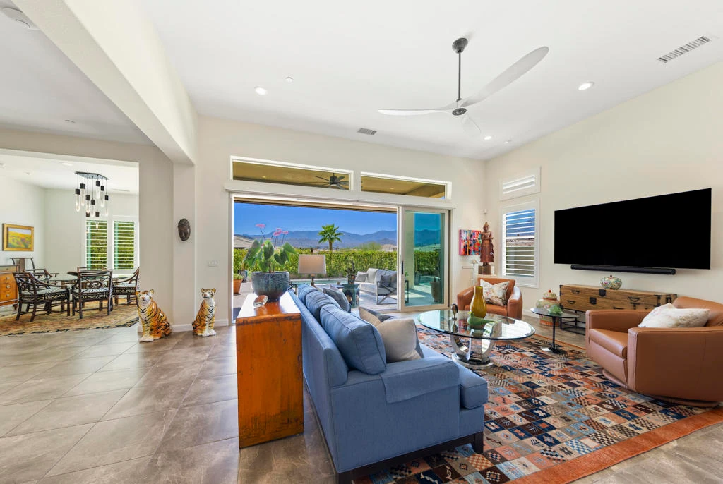 Welcome to this stunning SERENITY model with OWNED SOLAR and situated on an elevated corner lot to capture panoramic MOUNTAIN VIEWS. Featuring high ceilings and walls of glass, the home exudes luxury the minute you step into the rotunda foyer from the courtyard. The open floor plan centers on a sleek kitchen with KitchenAid appliances, granite countertops and an expansive island that flows into the living area with a MULTI PANEL SLIDING DOOR SYSTEM opening to a resort style backyard for true indoor/outdoor living. Enjoy the sparkling PebbleTec pool plus side patio with pergola for BBQ and al fresco dining. Two private ensuites are well separated for privacy and the luxurious primary suite with spa like bath and custom walk-in closet opens to the pool and fabulous mountain views. The office/den with french doors and custom built-ins can also be used for a third sleeping space. Conveniences include a wine fridge, laundry room with sink and the garage features a built-in workshop, lots of storage, a water softener, tankless water heater plus its own A/C unit and insulated garage walls/ceiling. With all the finest finishes and details, this home has been meticulously maintained and is ready for you to enjoy. Del Webb Rancho Mirage is the premier 55+ community with walking trails, incredible views and so convenient to upscale shopping and dining. Residents enjoy a low HOA fee that includes cable and internet, Clubhouse, pools, tennis courts, pickleball, putting green, fitness center and endless activities. Call today to schedule your private showing and see the best view at Del Webb RM.