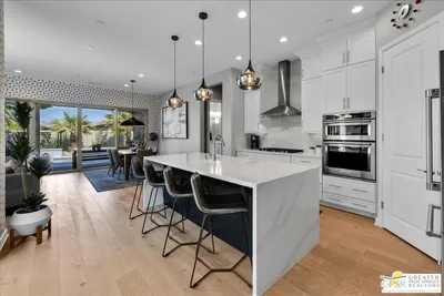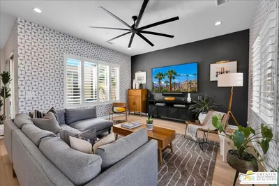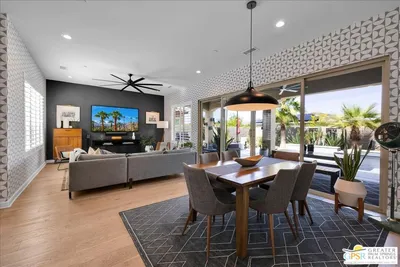 Designer Haven with Courtyard Living & New Pool/Spa - Del Webb Rancho Mirage. Welcome to this meticulously upgraded Phase 5, Plan 5 Haven with Spanish facade, where thoughtful design, modern finishes, and inviting indooroutdoor living come together beautifully. Offering 2 bedrooms, 2 baths, and a versatile den/flex space, this home stands out with its private CENTRAL COURTYARD - a signature feature perfect for morning coffee, intimate dining, or relaxed desert evenings. Inside, the home showcases a refined and fresh aesthetic with engineered WHITE OAK FLOORING, PLANTATION SHUTERS, and a curated palette of designer paint tones complemented by stylish wallpaper accent walls throughout. At the heart of the home, the stunning kitchen has been elevated with floor-to-ceiling white shaker cabinetry, modern brushed nickel hardware, quartz countertops, and a full-height white tile backsplash. The expansive island features waterfall edges, a Blanco sink, and hand-selected pendant lighting, creating a true focal point for both everyday living and entertaining. The living and dining areas are filled with natural light, enhanced by large windows and upgraded dual center sliding glass doors that open to the full-length covered patio. Beyond, a brand-new custom pool and spa set against mountain views create a private backyard retreat designed for both relaxation and entertaining. The primary suite offers a peaceful escape, complete with a tray ceiling, designer accent wall, upgraded carpeting, and enhanced lighting. The ensuite bath is both spacious and functional, featuring dual vanities with abundant counter space, a zero-threshold glass-enclosed RAIN SHOWER, and a large walk-in closet. Privately located on the opposite side of the home, the guest bedroom provides comfort for visitors with convenient access to a full bath with a tub/shower combination and glass enclosure. The flex space, enhanced with modern barn-style doors, offers endless possibilities as a home office, media room, fitness space, or creative studio. Additional upgrades include an enhanced laundry room with stained wood countertop, added cabinetry, and hanging rack, along with a 2.5-CAR GARAGE offering extra storage and functionality, energy-efficient features, and built-in storage solutions. The backyard has been thoughtfully redesigned to maximize enjoyment, featuring expanded patio space, the custom pool and spa, and even a charming yard swing - adding a unique and playful touch to the outdoor setting. Additional highlights include leased SOLAR ($139/month) for energy efficiency and cost savings. Located within the prestigious 55+ Del Webb Rancho Mirage community, residents enjoy access to a beautifully appointed clubhouse with social spaces, resort-style pool and spa, state-of-the-art fitness center, tennis and pickleball courts, and a vibrant calendar of activities - with HOA dues now including cable and internet for added convenience and value.
