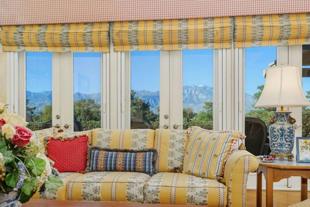 Experience the ultimate in luxury desert living with this stunning custom Country French home, perfectly positioned to capture unobstructed, breathtaking triple fairway Mt San Jacinto mountain views. This freestanding 'Evergreen' plan offers over $350,000 in custom upgrades and exudes elegance and comfort throughout. Rich hardwood floors, crown molding, plantation shutters, and built-in surround sound (including outdoor speakers) create a sophisticated yet welcoming atmosphere. The spacious living room features a cathedral ceiling, a custom wood mantel over a granite-accented fireplace, and a stylish built-in bar, making it ideal for entertaining. The gourmet kitchen showcases premium KitchenAid appliances, including a newly installed $10,000 built-in refrigerator, all complemented by expansive golf course mountain views. The primary suite is a serene retreat with a cozy fireplace, motorized curtains, and custom drapery, while the spa-inspired primary bathroom includes granite surfaces, a walk-in shower, and a real Jacuzzi tub. Additional bedrooms are thoughtfully designed for comfort and functionality, including a bedroom/den large enough for a couch/bed, a spacious ensuite guest bedroom with pool views, and an extended office/bedroom with built-in desks, cabinetry and a walk-in closet . Step outside to your private courtyard oasis featuring a heated saltwater pool/spa,& waterfall surrounded by expensive wicker patio furniture and a built-in brick barbecue. This home also includes a carpeted two-car garage with a golf cart bay, tons of built-in storage, and an upgraded paver driveway. Best of all, this home sits on fee simple land--no land lease--offering true ownership in one of the desert's most sought-after communities. Whether you're seeking a full-time residence or a luxurious seasonal escape, this home offers unparalleled style and comfort, with unmached West facing views over the green fairways and Mt. San Jacinto.