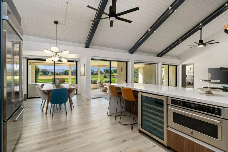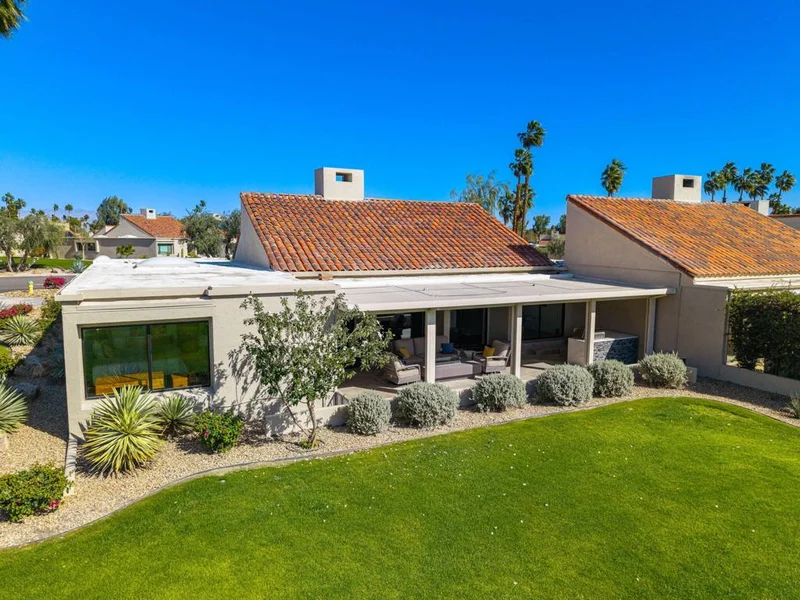 Welcome to Mission Hills Country Club living at its finest. This beautifully updated residence offers spectacular, unobstructed views of the San Jacinto Mountains and the sweeping fairways of the famed Dinah Shore Tournament Course an idyllic backdrop for desert luxury. Inside, the home has been reimagined with gorgeous custom cabinetry throughout, sleek quartz countertops, and a stunning waterfall-edge quartz island that anchors the contemporary kitchen. Newer windows and sliding glass doors frame the panoramic views while enhancing energy efficiency and natural light. Modern comfort continues with a newer HVAC system, updated water heater, and thoughtful contemporary finishes in every room. Motorized shades--both inside and on the rear patio--allow you to transition seamlessly from bright desert days to soft, ambient evenings. Step outside to an expansive patio designed for effortless indoor-outdoor living, perfect for morning coffee, sunset cocktails, or watching golfers play through.