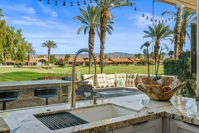 Welcome to this luxurious turnkey furnished condo inside Mission Hills CC East, FEE land not on lease. A beautifully remodeled desert retreat offering panoramic mountain views and perfectly positioned above the 5th green at the Westin Pete Dye course. This unit captures breathtaking vistas from inside your kitchen, living and exterior space that includes a spacious built in BBQ bar and ample seating with this extended patio. Enjoy the outdoor setting to include stunning desert sunsets, Outdoor TV entertaining area and watching the golfers with their golf shots. While you step inside to a completely updated property featuring a striking kitchen showcasing Cafe GE appliances, built in dry bar with wine refrigerator, stylish finishes and a layout designed for everyday living and has ample entertaining space, new flooring, fresh paint, modern baseboards, built in electric fireplace which creates a warm contemporary focal point in the living space. Remote control blinds allow this easy to keep the window treatments up for the day to enjoy these views. The bathrooms have been renovated with elegant, modern touches, while the 3rd bedroom has been used as a functional office, ideal for remote work or a private den.The outdoor living is just as impressive, with the extended patio, built in BBQ and an electric awning to add shade or additional outdoor roomy feel. The perfect setting to relax, entertain and take in the sweeping views. Additional upgrades include newer HVAC, water heater, providing comfort and peace of mind. New inside doors and entry door. This move in ready home blends modern upgrades with resort style living in one of the most desirable country clubs. Memberships available for social and golf. Located near world class golf and tennis..