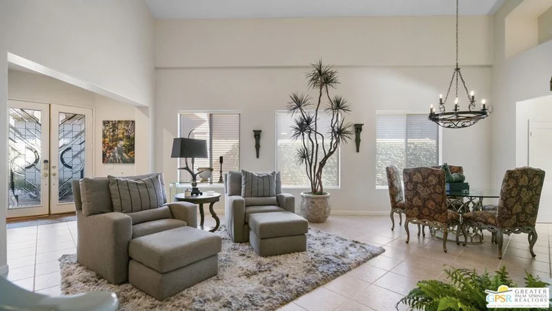 Nestled within the well-maintained grounds of Rancho Mirage Country Club, this four-bedroom residence offers a thoughtful blend of space, comfort, and setting. Surrounded by manicured fairways and mountain views, the home enjoys a quiet position within the community, where mature landscaping and maintained grounds create a sense of privacy and order. Inside, vaulted ceilings and clean lines provide openness without excess. Natural light flows through upgraded Pella windows and doors, connecting the interiors to the surrounding landscape. A redesigned fireplace anchors the main living area, and surround sound in the den adds a practical touch for everyday living. The home has been carefully updated with long-term efficiency in mind. A fully owned 47-panel Hyundai solar array producing approximately 14.1 kW supports energy performance, complemented by dual American Standard HVAC systems. The garage is air-conditioned with a Mitsubishi split system, offering added flexibility for storage or workspace needs. The property is also hardwired for a security system. Outdoor living centers around a newly resurfaced pool supported by a Pentair high-efficiency pool pump, with power-operated retractable awnings providing shade and comfort throughout the year and offered furnished for a smooth transition, whether as a full-time residence or seasonal retreat. With a $950 monthly HOA and access to one of Rancho Mirage's established country club communities, this property presents a well-rounded opportunity for buyers seeking space, efficiency, and a comfortable desert setting.