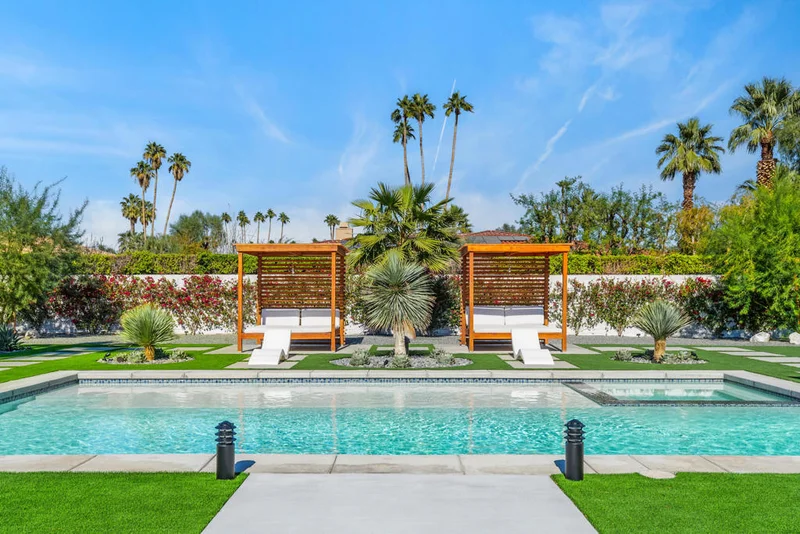 Welcome to a beautiful modern retreat in Rancho Mirage, where luxury and timeless design meet. This 4-bedroom, 3-bathroom home, set on a private .42-acre lot, captures the essence of resort-like living with sweeping mountain views and sophisticated indoor-outdoor spaces. The light-filled Great Room greets you with floor-to-ceiling windows, vaulted wood plank ceilings, and contemporary light fixtures. Concrete-look porcelain tile flooring and a sleek electric fireplace add a touch of refined elegance. The gourmet kitchen features Viking appliances, a wine fridge, waterfall quartz countertops, and a spacious breakfast bar. The primary suite is a true sanctuary with custom finishes, a walk-in shower, dual sinks, and a well-organized closet. An additional suite with a private entrance and kitchenette offers a versatile casita option. A leased solar system ensures energy efficiency. Outside, this home is an entertainer's dream. Privacy walls surround the backyard's custom pool, spa, tanning shelf, two luxury cabanas, a fire pit, a bocce ball court, and BBQ. Landscape lighting enhances the space, creating a stunning desert oasis. Situated in the heart of Rancho Mirage, this property is minutes from Palm Springs, Palm Desert, and the famed El Paseo shopping district, with easy access to golf courses, hiking, and top dining. This home offers a blend of privacy, elegance, and modern desert living in one of the Coachella Valley's most desirable locations.