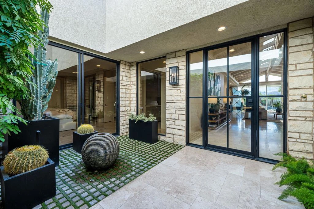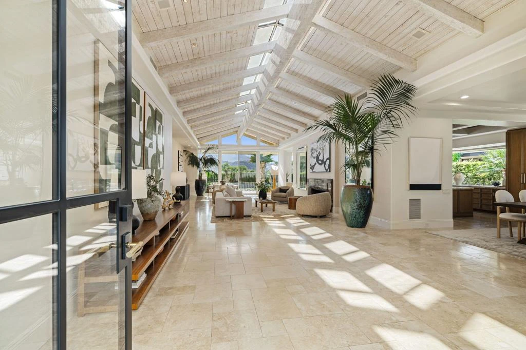 Stunning remodeled estate in Rancho Mirage featuring 4,640 sq ft, 4 bedrooms, and 4.5 bathrooms, ideally positioned to capture unobstructed western mountain views and breathtaking sunsets. Located in a highly desirable area, this architecturally striking home offers soaring wood-beam ceilings, dramatic skylights, and expansive walls of glass that fill the home with natural light and create seamless indoor-outdoor living. The open-concept living room, kitchen, and primary suite all showcase incredible mountain views, making this home perfect for both everyday living and entertaining. Thoughtfully remodeled approximately five years ago, upgrades include elegant marble flooring, a fully renovated pool with PebbleTec finish, updated equipment, saltwater system, and approximately $90,000 in owned solar for energy efficiency. The flexible floor plan offers four true bedrooms, including a private suite with an attached sitting room--ideal for guests, a home office, or multi-generational living. The gourmet kitchen features Thermador and Sub-Zero appliances, custom cabinetry, and a large center island. Outdoor living is exceptional, with a private resort-style backyard featuring a pool and spa, built-in BBQ, outdoor refrigerator and sink, lush landscaping, and panoramic mountain views. Additional features include a Pentair whole-house water filtration system and a discreet, fully enclosed dog run. A rare opportunity to own a move-in ready, view-focused home in Rancho Mirage with luxury upgrades, solar efficiency, and an ideal layout.