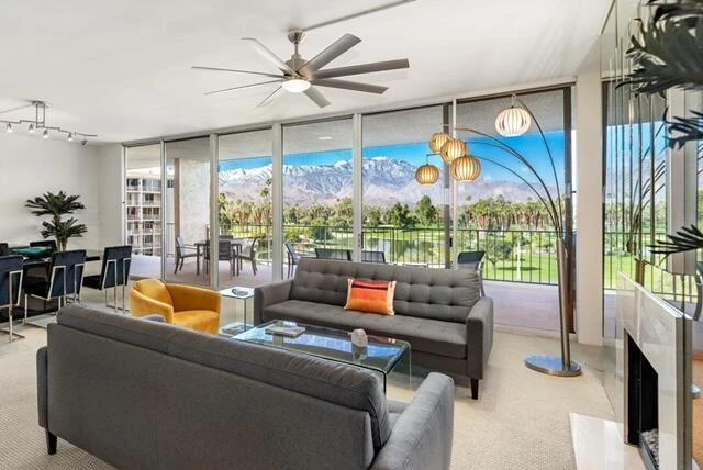 BREATHTAKING VIEWS!!!Expansive floor to ceiling walls of glass in all living areas lead to a spacious patio with sweeping views of the San Jacinto mountains, lakes & 18 hole golf course! Patio includes 2 ceiling fans and natural gas BBQ. This 5th floor 1,864 sq. ft. 2 bedroom 2 bath condo is centrally located on 25 park-like acres, in the beautiful Desert Island Community of Rancho Mirage. The open great room has spectacular views, high ceilings, fireplace, home theater TV area and dining area. Kitchen has granite counters and stainless appliances. Master bedroom has large walk-in closet + a wall of closets and large screen TV. Both bedrooms have 9' sliding doors with direct access to the large patio. Master bath has dual sinks with make up vanity. Separate laundry room includes washer/dyer unit, ample storage and a brand new upgraded electrical panel. All popcorn ceilings have been removed. A brand new A/C Chiller Pipe system is currently being installed in the building, and the assessment has been paid. Amenities include park like grounds, tennis/pickleball, fitness room, heated pools & spas, subterranean parking with storage locker and access to 18 hole golf course. HOA includes gas, water, trash, cable, Wi-Fi, pedal boats, fishing, exterior maintenance, landscaping and 24 hour guarded gate. Don't miss the rare opportunity to own a high floor view condo in this special community!