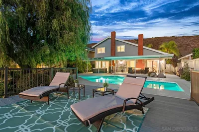 If you’ve been searching for a custom remodeled and expanded home in an award-winning school district on the famous Christmas Card Lane in Rancho Peñasquitos, your search ends here. This thoughtfully designed residence offers 4 bedrooms, a dedicated home office, 3.5 bathrooms, and a two-car garage with ample storage. A spacious bonus room—complete with its own kitchenette and bathroom and conveniently located near the pool—was designed to accommodate social gatherings of all kinds. With nearly 3,000 sq ft of highly flexible, open-concept living space, the kitchen sits at the heart of the home, creating a natural hub for everyday living and entertaining. Over 35 windows, sliders, and skylights flood the home with natural light. A one-of-a-kind covered rooftop deck overlooks a private backyard. The home is equipped with entertainers’ double ovens, ideal for hosting, and fully paid-for solar, delivering long-term energy efficiency and added value. Ideally located close to highly rated public elementary, middle, and high schools, and set in an established, desirable neighborhood offering a wide variety of sports, enrichment, and community amenities. A rare opportunity for flexible living, entertaining, and long-term comfort.