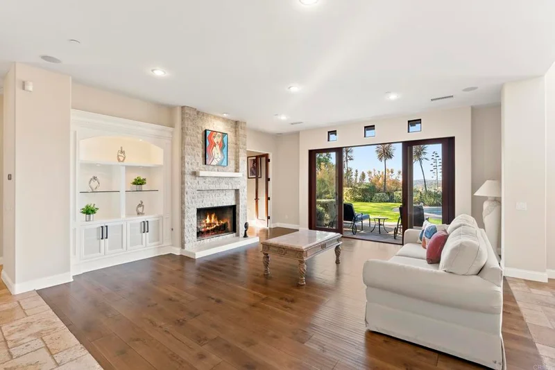 At the end of a quiet cul-de-sac within the gated community of The Groves, 18102 Via Ascenso offers privacy, sweeping views, and resort-style living on 1.23 beautifully landscaped acres. A long tree-lined driveway and manicured grounds lead to a stately residence filled with natural light, where soaring two-story ceilings and expansive windows frame the backyard and surrounding views. The 5 bed, 5.5 bath main residence showcases a thoughtful floor plan designed for both everyday living and entertaining. The chef’s kitchen features an oversized island, quartz countertops, luxury appliances, walk-in pantry, and a casual dining area overlooking the yard. The adjacent family room opens through bi-fold doors to a covered California room with fireplace and built-in BBQ, creating seamless indoor-outdoor living. The layout offers exceptional versatility with two bedrooms, 2.5 baths, and an office, on the main level. Upstairs, the primary suite includes a fireplace, sitting area, view terrace, custom walk-in closet, and spa-style bath with jetted tub and oversized shower. Two additional ensuite bedrooms and a bonus room complete the upper level. A detached single-level 1 bed, 1 bath guest house with its own kitchen and living area provides ideal accommodations for guests, extended family, or long-term stays. Outdoor amenities include an infinity pool and spa, grassy lawn, putting green, sports court, and a fully fenced upper orchard with orange, grapefruit, lemon, and avocado trees. Additional highlights include hardwood floors, travertine tile, built-in sound, zoned HVAC, and an oversized four-car garage with pull-through access. Located within the gates of The Groves and served by the highly regarded Roger Rowe School, just minutes from Rancho Santa Fe Village, golf, dining, and trails.