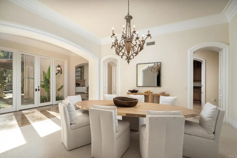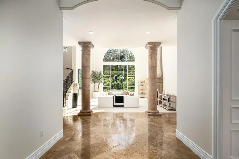 Nestled within the prestigious guard-gated community of The Bridges in Rancho Santa Fe, 6627 Calle Ponte Bella is a masterpiece of timeless elegance and unparalleled craftsmanship. This estate is more than just a home—it's a lifestyle. From the moment you arrive, the lush landscaping and grand presence set the stage for what lies beyond. Step inside to discover an expansive interior that seamlessly blends old-world charm with modern luxury. Soaring ceilings, intricate woodwork, and arched doorways create a warm yet stately ambiance. The gourmet kitchen is a chef's dream, featuring top-of-the-line appliances, custom cabinetry, and a spacious center island perfect for entertaining. The living spaces are equally impressive, with natural light pouring through oversized windows, framing stunning views of rolling hills and meticulously manicured grounds. The primary suite is a private retreat, offering a spa-like bathroom and walk-in closets that rival a boutique. Each additional bedroom includes en-suite accommodations, ensuring comfort and privacy for family and guests alike. Outside, the magic continues—a resort-style pool and spa, outdoor kitchen, and multiple seating areas provide the perfect backdrop for alfresco dining, sunset cocktails, or simply soaking in the serenity of your surroundings. With impeccable design, a prime location, and unmatched lifestyle offerings, 6627 Calle Ponte Bella is not just a home—it’s an experience waiting to be lived.