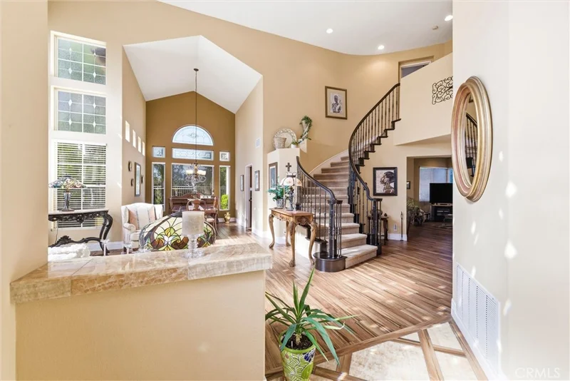 Located in the desirable Estrella Vista community of Melinda Heights, this beautifully upgraded turnkey residence offers 4 bedrooms, 3 bathrooms, PLUS a large bonus room, including a main-floor bedroom and full bath. Impressive entry with custom marble stone flooring, soaring cathedral ceilings, formal living room, and formal dining room with custom stained-glass windows. Elegant spiral staircase features designer wrought-iron railings. The downstairs showcases plank-style tile flooring with a hardwood appearance and upgraded baseboards throughout. Spacious family room with a cozy fireplace, opens to the kitchen with newer granite countertops, wood cabinetry, walk-in pantry, stainless steel appliances, dual ovens, and a large garden window for abundant natural light. Breakfast nook with a sliding glass door that opens to the patio. Separated downstairs laundry room with sink and abundant cabinetry. Upstairs includes 3 spacious bedrooms, including a large primary suite with retreat area, custom-organized walk-in closet, mirrored secondary closet, and en-suite bath with walk-in shower and soaking tub. Expansive bonus room offers flexible space for entertaining, media, or office use. The home has been completely re piped with Pex Piping. Private backyard features a covered patio, built-in BBQ, in-ground spa, low-maintenance turf, beautiful landscaping, and stunning sunset views. Conveniently located near Solana Park, Melinda Heights Elementary School, shopping, dining, and SAMLARC amenities, including pools, parks, tennis, pickleball, volleyball, basketball courts and extensive hiking and biking trails. The Beach Club, is a resort style oasis featuring a sand bottom swimming lagoon, peaceful lounge areas and an abundance of shade trees to relax. The crown jewel, Lago Santa Margarita, offers scenic lake views, five fitness stations and fishing spots with amazing views of Saddleback Mountains. This is an amazing opportunity to own a home that is move in ready and offers a resort style living!!!