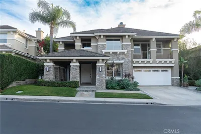 Welcome to your destination home in the gated community of Walden in Trabuco Canyon where breathtaking views, thoughtful design & everyday comfort come together in perfect harmony. This beautifully updated contemporary residence offers a highly desirable open floor plan. A grand double-door entry past a sparkling water feature welcomes you, setting the tone for effortless lifestyle awaiting inside. Step into the light-filled living & dining rooms w/ soaring vaulted ceilings - a dramatic yet inviting atmosphere. The living room features an elegant fireplace while formal dining room windows frame panoramic west-facing views of rolling hills, spectacular sunsets, where nature’s brush paints breathtaking vistas each evening. The remodeled kitchen is the heart of the home, thoughtfully designed with modern finishes & seamless flow into the family room—perfect for gatherings large or small. Ideal for multi-generational living, the first floor includes a private bedroom with its own en-suite newly redesigned bathroom, offering comfort & flexibility for guests or extended family, in addition to an upgraded guest powder room & a spacious laundry room. Upstairs, your airy primary suite is a true retreat featuring its own fireplace, panoramic views, en-suite bathroom with a new step-in shower, as well as a soaking tub adjacent to the fireplace. Additional bedrooms & bonus room (currently an office) provide plenty of space for family, work, or hobbies. Hallway bathroom is a freshly redesigned space w/ a brand new shower & dual vanity w/ new light fixtures. Recent improvements include owned solar, flooring, dual-pane windows & fresh interior & exterior paint. Step outside to your easy-to-maintain backyard oasis, where a covered patio & a tranquil waterfall create the perfect setting for relaxing or entertaining while enjoying the dreamy panoramic views. The soothing sounds of winds caressing palm fronds feed your spirit. Additional highlights include a 3-car garage & access to a tranquil community pool and spa, a picturesque catch-and-release fishing pond, and beautiful natural surroundings. Walden is conveniently located near award-winning schools, major employment centers & shopping, dining & entertainment; nearby hiking & biking trails nurture your adventurous spirit. Rarely does a property combine scenic beauty, modern updates & versatility in such an exceptional setting. Come experience the lifestyle … this is more than a home, it’s a destination!