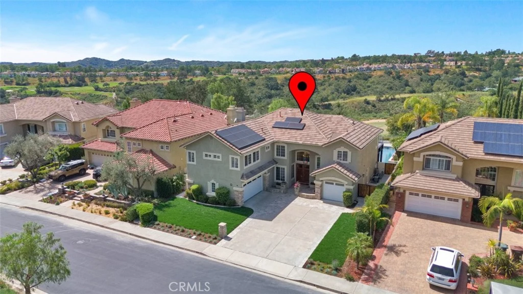 Prepare to be captivated by this exceptional residence at 49 Bell Canyon Drive, located in prestigious Dove Canyon. Offering over 4,000 sq ft of refined living space, this remarkable home features six bedrooms, four bathrooms, and is perfectly positioned to capture serene hillside views, elevated golf course vistas, and spectacular sunsets. The backyard is a resort-style retreat with a modern pool, waterfall, spa, fire pits, and an expansive covered patio. Enter the home through custom double doors, to reveal breathtaking views and a thoughtfully upgraded interior, showcasing new luxury vinyl plank floors, new carpet, and fresh interior/exterior paint. The chef’s kitchen features updated soft-close cabinetry, new Bosch dishwasher, and newer stainless-steel appliances, including built-in refrigerator, double wall ovens, microwave, and gas cooktop. A breakfast nook with built-in seating and a walk-in pantry complements the space, which opens seamlessly to the family room and cozy fireplace. The main level includes a guest room and en-suite bath with walk-in shower—and serves as a convenient cabana bath. Upstairs, the luxurious primary suite offers its own fireplace and elegant French doors leading to the view deck. The remodeled primary bath is a spa-inspired sanctuary, featuring custom built-ins, floor-to-ceiling porcelain tile, frameless glass shower, and soaking tub. A generous walk-in closet with custom organization completes the suite. Adjacent is a laundry room equipped with an Electrolux washer and dryer and abundant storage. The upstairs includes a recreation room with built-ins and deck access, a secondary bedroom, and two expansive en-suite bedrooms, each with their own walk-in closets. Additional highlights: plantation shutters, upgraded HVAC with dual heat pumps, whole-house air purification system, new 80-gallon electric water heater, and whole-home water filtration system. Energy-efficient features include Tesla solar panels, EV chargers, solar pool heating, and new garage doors. The property also boasts refreshed landscaping with new sod and updated drainage and irrigation. Residents of Dove Canyon enjoy resort-style amenities, including swimming pool/spa, tennis/pickleball courts, tot lot, basketball court, and 24-hour guard-gated security. Optional membership to the Jack Nicklaus–designed Dove Canyon Golf Club offers access to a fitness center, dining, and social events, completing the elevated lifestyle this extraordinary home provides.