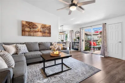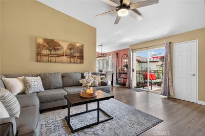 BACK ON THE MARKET AT NO FAULT OF SELLER! BUYER LOST THEIR JOB AND COULD NO LONGER PERFORM. This meticulously cared-for carriage-style condo features an interior sweeping stairway leading to a spacious single-level floor plan. All living areas are located on one level above the attached one-car garage, offering the added benefit of no one above or below. Step inside to dramatic high ceilings and an abundance of natural light that fills the open floor plan. The living room is enhanced by a cozy fireplace and sliding doors that lead to a sunny deck, an ideal spot to unwind at the end of the day. Designed with both style and function in mind, the kitchen showcases granite counters, crisp white cabinets, stainless steel appliances, a pantry, and a glass tile backsplash. The generously sized dining area, just off the kitchen, provides flexibility for everyday meals and special occasions alike. Vaulted ceilings enhance the sense of space in the inviting primary suite, complete with a walk-in closet and a dressing area with dual sinks and a shower-tub combination. The secondary bedroom is perfect for guests, a home office, or a den. Additional highlights include Luxury Vinyl flooring, a newer HVAC system, a tankless water heater, and a community-wide repiping was completed. Located in the desirable Serabrisa community, residents enjoy a beautifully updated pool, spa, and BBQ area. Just across from Arroyo Vista Park, and close to Tijeras Creek Golf Course, shopping, dining, schools, and trails. With SAMLARC membership, enjoy access to Lago Santa Margarita Beach Club, multiple pools, sports courts, scenic hiking and biking trails, and year-round community events.