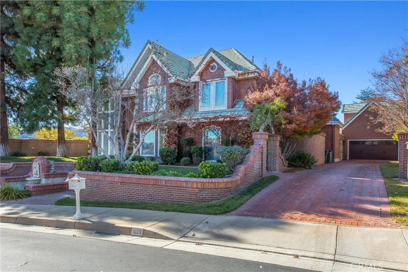 Magnificent home in the exclusive gated community of Smiley Ridge. This beautiful brick residence features classic leaded-glass windows that fill the home with natural light, charming brick planters, a front courtyard fountain, and mature landscaping throughout. Enjoy spectacular panoramic views of San Timoteo Canyon from multiple levels of the home. Inside, the 5-bedroom layout offers excellent flexibility. The main level features wood flooring and two bedrooms, including the primary suite with dual sinks, a separate shower, and a jetted soaking tub. Upstairs are three additional bedrooms plus a spacious family room/loft overlooking the living room below. The bright, functional kitchen includes stainless-steel appliances, a peninsula with a sink, and recessed lighting. A newly remodeled guest house sits above the garage with views of the pool—ideal for guests, multigenerational living, or a private office. The backyard is designed for privacy and enjoyment, bordered by brick walls and wrought-iron fencing.
