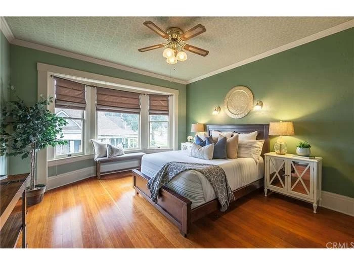 Master Bedroom with private bathroom and private loft to enjoy your afternoon wine or breakfast coffee. View to the back yard, with amazing greenery. Beautiful American Four square style home. is located just a few blocks from Downtown Redlands. This property won the historical Heritage award in 2015.community areas includes, kitchen, breakfast nook, dining room, living room, 2 patios. additional pictures of the house and room will be added shortly.