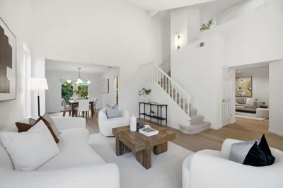 This chic 2-story home in the gated community of Kentfield Commons blends transitional design with a light-filled floor plan, offering stylish and comfortable living. A covered brick front porch makes for a warm and inviting entry, while inside a stunning great room impresses with vaulted ceilings and dual glass doors opening to the rear patio through the formal dining room. The chefs kitchen features stainless steel appliances, honed countertops and custom cabinetry. The breakfast area opens to the back patio as well as to the media room with custom built-ins and a half bath with a hammered copper sink. Upstairs, the large primary suite is a private retreat featuring a bath with Mediterranean finishes, while three additional bedrooms and full bath are situated off the hallway. Additional highlights include luxury vinyl plank downstairs, newly carpeted bedrooms, dual-pane windows, contemporary lighting and freshly painted interior and exterior. The private, low-maintenance backyard features a brick patio, native plantings, flowering bulbs and landscape lighting. Kentfield Commons amenities include a gated entrance, a 2 ½ acre park, playground and a Junior Olympic pool. Easy access to top employers, downtown Redwood City, Stanford University, shopping, dining and entertainment.