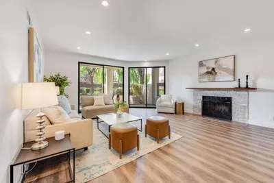 Enjoy Contemporary Tranquility surrounded by a lagoon & fountains in this 2BD/2BA modern Redwood Shores townhome with designer style minutes to Oracle, Nob Hill Foods and the library. Amenities abound including a pool, hot tub, garage parking, well-maintained grounds, Nest thermostat & an updated interior. Water views welcome you into this airy home with high ceilings and a living room warmed by a stone fireplace and a wall of sliding glass doors onto the patio overlooking a weeping willow & pond. The open, modern kitchen features flat front cabinets, quartz countertops & a wrap around peninsula with bar height seating. Stainless steel appliances & a peaceful dining room with a bank of windows completes the living area. The large primary suite has multiple big closets, a sliding glass door onto the patio & a remodeled en suite bath with a new dual vanity & a handsome walk in shower in designer tile. This town home is close to the Belmont Caltrain station, 101, Bay Club & Bay trails.