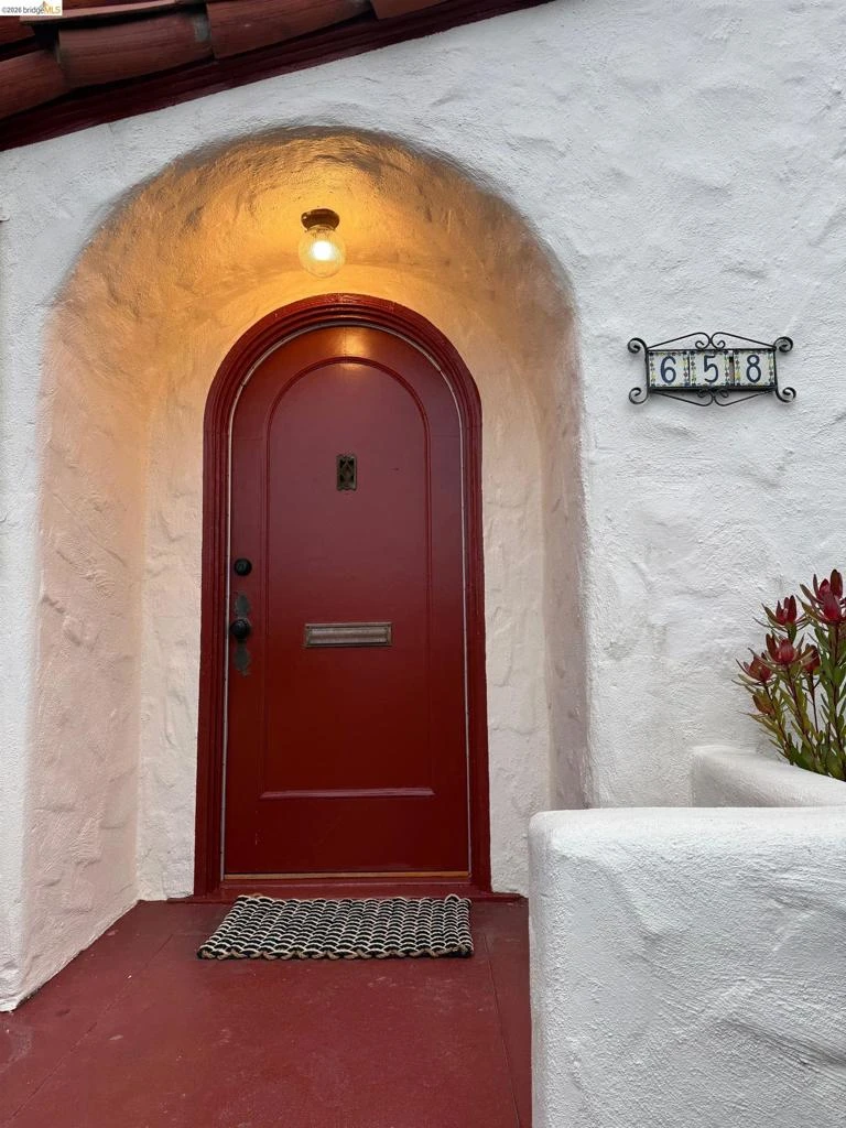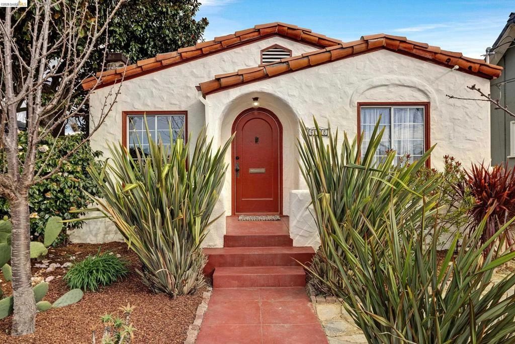 Friendly neighborhood, affordability, convenient amenities, an adorable house with parking and bonus space… it’s all here! Step through the delightful brick-red arched door into this single-level Spanish-style bungalow and find warmth and ease. From the distinct wood-mantle fireplace to the series of arches throughout the house, architectural charm abounds. The updated kitchen features butcher block and quartz counters, hexagon-tile backsplash and stainless-steel appliances. At the heart, sunlight spills through a tall window with a view of the backyard oasis. A breakfast nook offers a sweet spot to sip morning coffee. And the kitchen “annex” has a washer and dryer and easy outdoor access. Two comfortable bedrooms share a bathroom in between. The hallway has two linen closets, a 1920s telephone portico, and pull-down ladder access to attic storage. The backyard is your private haven with beautiful low-maintenance landscaping, spacious enough for entertaining or lounging. The large wood-paneled bonus space opens wide with two sets of double carriage doors. Your art studio, music room, office, gym or cottage? Let your imagination decide. This prime location is close to parks, schools, two BART stations, the Ferry Terminal, restaurants, cafes and easy freeway access.