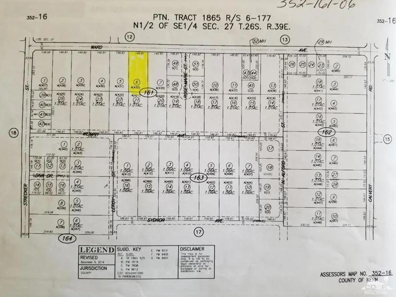 Ridgecrest, Ca. Over an Acre of Land (45,968sf M/L). for Sale. W Ward Avenue. Unimproved Residential property is Located Between Strecker St & Calvert Rd, Just West of Rosemarie Ct Culdesac, E of North Leroys. Land is approx. 375 feet (To center of Subject Property). Build your dream property. Close to City of Ridgecrest and close access to Hwy Rte 178. Close to homes. APN 352-161-06 Zoned Residential T zone. Located on the South side of W Ward just 6 parcels East of Strecker St. Latitude 35.644062 Longitude -117.764735.