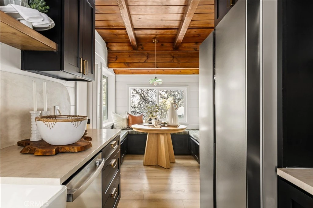 BACK ON THE MARKET! Escape to this impeccably remodeled and peaceful Rimforest retreat that's nestled just a few short minutes from Lake Arrowhead and away from the hustle and bustle of every day life! Backing directly to National Forest land, the privacy and access to nature that is offered by this property is extremely rare in Rimforest. Combining the perfect blend of rustic charm and modern comforts, this inviting cabin features an expansive multi-level floorplan that is perfectly designed to accommodate owner occupancy, short term rentals, or a second home getaway! Redesigned and expertly curated by Havend Home Foundry, this cabin offers a new gorgeous galley kitchen with stunning limestone countertops and custom backsplash, an oversize fireclay farmhouse sink, open shelving, black shaker cabinets with vintage-inspired antique brass hardware, stainless steel appliances (fridge included!) and cozy built-in banquette seating at the eat-in kitchen! All new shaker style doors throughout, medium tone flooring, custom interior and exterior paint, a diligently curated lighting plan that truly allows for a variety of entertaining or relaxing spaces throughout, three brand new bathrooms with natural stone countertops, timeless white subway tile, and a luxurious soaking tub at the lower level primary suite. If having a self-contained unit is something you're looking for, then you'll appreciate the dual primary suites this cabin offers, with the downstairs suite having its own separate entrance, designated driveway, sitting area, and kitchenette. Every single detail was taken into consideration in the redesign of this cabin including brand new windows throughout, brand new gas furnaces, and a brand new roof on the rear run of the home. While the interior offers an exceptional amount of possibilities, the 30,000+ square foot lot is just as promising! If you're interested in building another home on the lot or perhaps sub-dividing and selling off some of the land, that can also be done. Complete with paved parking on 3 separate driveways (potentially fitting up to 6 cars depending on their sizes), this cabin is incomparable to any others in the Rimforest area. So if you're ready soak up the crisp mountain air, unwind next to a roaring stone fireplace or amongst the serenity of your own outdoor oasis after a long day of outdoor adventures, then look no further than this cabin!