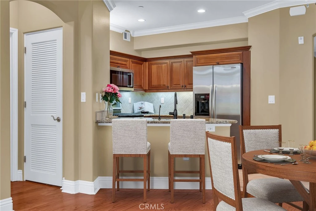 Welcome home to Rolling Hills Villas, a highly sought-after 55+ community located in the heart of Rolling Hills Estates. This beautifully updated two-bedroom condominium offers the perfect blend of timeless charm, modern comfort, and an unbeatable walkable location on the Palos Verdes Peninsula close to restaurants, shoping, gorcery stores, and the library. Light-filled and inviting, the residence features wood floors, arched doorways, crown moldings, plantation shutters, and soaring ceilings that create a warm, elegant atmosphere throughout. The open living and dining areas are anchored by a cozy fireplace and flow seamlessly to a private balcony, ideal for morning coffee, evening relaxation, or enjoying a potted vegetable garden. The kitchen is thoughtfully designed for both everyday living and entertaining, featuring granite countertops, newer stainless steel appliances, ample cabinetry, and a convenient breakfast bar that opens to the main living space with travertine tiles in entry and kitchen. Whether hosting friends or enjoying a quiet meal at home, the layout offers comfort and functionality. The spacious primary suite provides a peaceful retreat with generous closet space and an ensuite bath featuring tile finishes, a wood vanity, and modern fixtures. The second bedroom is equally versatile, perfect for guests, a home office, or hobby room, and is complemented by a full bathroom with a tub/shower combination which could also be perfect for a live-in caregiver down the road. Additional highlights include in-unit stackable washer and dryer, air conditioning, tankless water heater, dual-glazed windows, recessed lighting, and secure gated parking for one car. The building offers elevator access and a beautifully appointed lobby centered around a resort-style atrium with a bubbling fountain. Residents also enjoy a rooftop deck with BBQs, tables, lounge seating, and umbrellas, perfect for entertaining or relaxing. Ideally located just steps from shops, restaurants, grocery stores, pharmacy, medical offices, post office, library, Norris Theatre, Peninsula Center, Promenade PV, and movie theaters. Scenic hiking trails, golf courses, and local parks are just minutes away. A rare opportunity to own a two-bedroom home in the desirable Rolling Hills Villas, offering low-maintenance living, excellent amenities, and one of the Peninsula’s most convenient locations. Ample street parking for a second car or guest. It is even pet friendly! (staging is AI)