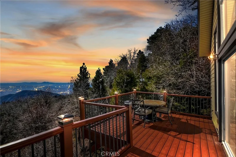Welcome to your private mountain retreat! This stunning three-level home offers breathtaking panoramic views of sparkling city lights, majestic mountains, and lush forest canopy from multiple vantage points throughout the property. The main level welcomes you with an inviting living room anchored by a striking river rock fireplace, creating the perfect ambiance for relaxation. The well-appointed kitchen features a convenient breakfast bar and dining area, ideal for both casual meals and entertaining guests. Step through to the upper back deck and prepare to be captivated by the sweeping vistas that stretch before you. This level also includes a comfortable bedroom and full bathroom, offering convenient single-level living if desired. Ascend to the top level where the luxurious primary suite awaits. This serene retreat features its own cozy rock fireplace for intimate evenings and spectacular views to wake up to each morning. The spa-like primary bathroom is designed for indulgence, complete with dual sinks for busy mornings, a relaxing jetted tub for unwinding after a long day, and a separate walk-in shower. The lower level transforms into an entertainer's dream with a dedicated game room that includes a pool table and electronic dart board, perfect for hosting friends and family. The private bar adds a sophisticated touch for gatherings, while the laundry closet provides practical convenience. Another bedroom and full bathroom on this level ensure comfortable accommodations for guests, and access to the lower back deck provides yet another spectacular setting to enjoy those unforgettable views. With easy, level parking and thoughtful design throughout, this exceptional property offers the perfect blend of mountain living and modern comfort. Every level of this home has been crafted to maximize the stunning natural surroundings while providing the amenities and space for comfortable everyday living and memorable entertaining. This is a great, short drive location to Running Springs town, Hwy 330 for commuters, Snow Valley Ski Resort, Green Valley Lake, Sky Park At Santa's Village, etc.!
