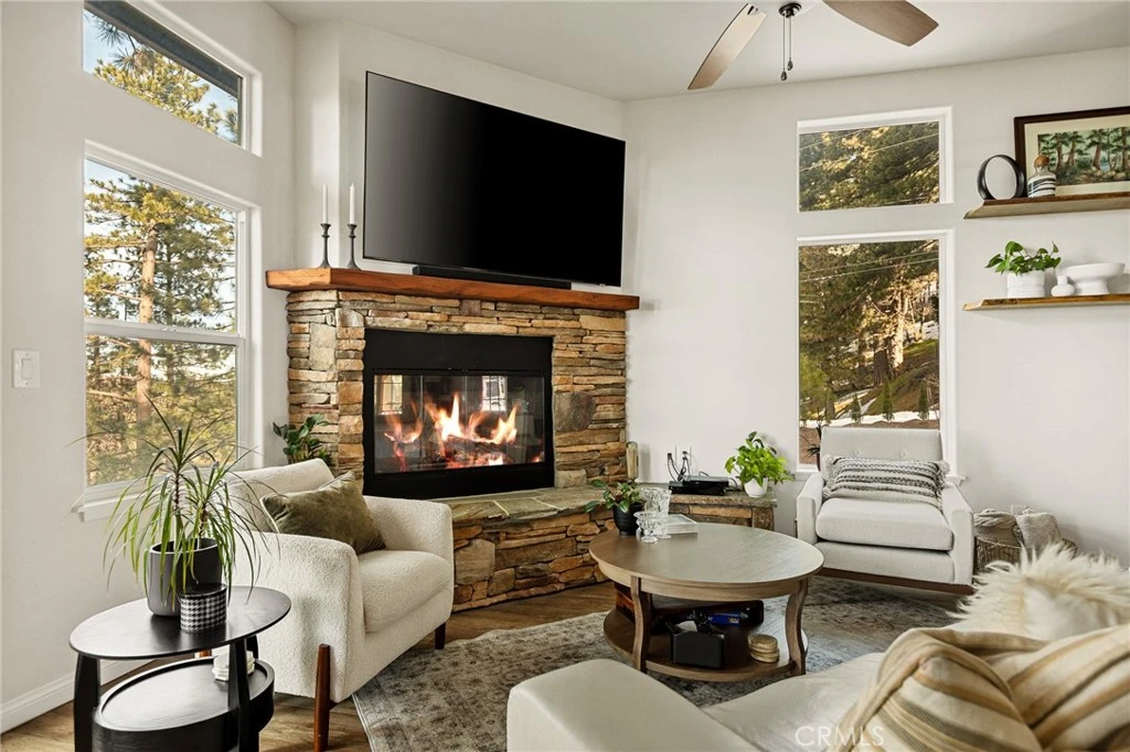SPECTACULAR MODERN MOUNTAIN HOME! Welcome to this immaculate 3-bedroom, 2-bath home offering a breathtaking sunset & city lights view and exceptional pride of ownership throughout. Whether you’re seeking a full-time residence or a serene vacation getaway, this beautifully maintained property delivers comfort, functionality, and unforgettable surroundings. Located close to Hwy 330 making a daily commute down the mountain a breeze. The home comes equipped with central heating, air conditioning, fully sprinklered fire protection system, tankless water heater and an attic fan. Upgrades include LVP flooring, ceiling fans, stacked stone fireplace, wood tread staircase and stainless steel appliances. Step inside to soaring 10-foot ceilings surrounded by windows that create natural light with an open, airy ambiance. The kitchen features an oversized island with a beautiful granite counter top and a downdraft range and oven along with Kraftmaid cabinets with self-closing drawers and doors. The MAIN-FLOOR PRIMARY BR offers convenience and privacy, with direct access to the spacious deck—perfect for enjoying morning coffee or evening sunsets overlooking the twinkling lights below. Upstairs, you’ll find two additional bedrooms connected by a Jack & Jill bathroom, along with a versatile loft area currently used as a home office—ideal for remote work or additional living space. The charming front porch adds warmth and curb appeal, while the large rear deck expands your living space outdoors. Inside laundry enhances everyday ease, and the attached two-car garage provides convenience and security. Rare for the mountain area, this property offers ample parking along with generous under-house storage—perfect for seasonal items and outdoor gear. The upgraded landscape design is as thoughtfully cared for as the home itself. Turnkey, exceptionally maintained, and designed for both everyday living and peaceful escapes—this is modern mountain living at its finest. Just minutes from Lake Arrowhead, Big Bear, Snow Valley Ski Resort, and hiking trails, this move-in ready property is perfect as a full-time home, vacation escape, or rental investment. Enjoy the quaint town of Running Springs with its markets, restaurants, shops, post office and library. Schedule your showing today and experience mountain living at its best!