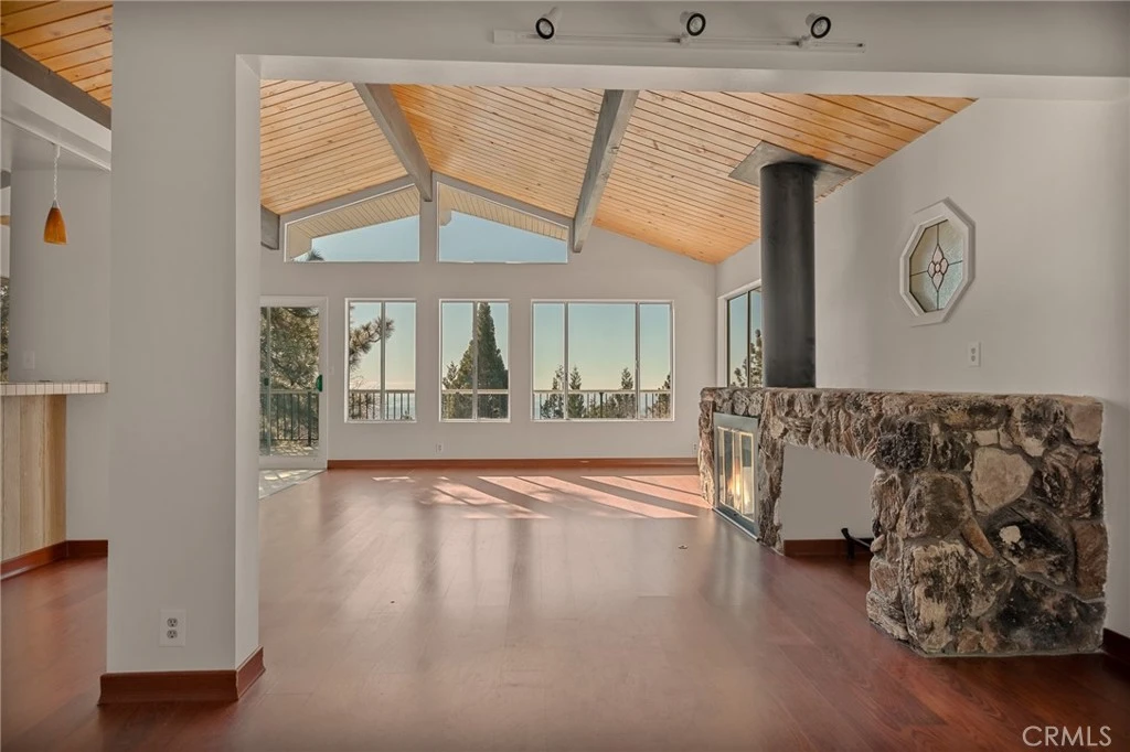Wow what a view! This Running Springs home, located close to town, and Hwy 330, and not far from Snow Valley is near level entry and will stun you with it's distant panoramic views. Arrive to your home with a near level driveway and only a few steps to the front door. Once inside you will find on the main floor, a bedroom with bath, an office room that could be the 5th bedroom, the second bath, large living room with vaulted ceilings, a large fireplace as a focal point, lots of windows to capture the view, the dining room and the kitchen. The back deck and view will allow you to see distant city lights and views of the southland. Downstairs is 3 more bedrooms and laundry room. Home is equipped with vinyl siding, newly installed carpet and sliding glass dual pane doors, and located on a county plowed road. The water heater was just replace in Jan 2026. This home has so much to offer that it is a must see to appreciate, don't pass this one up.