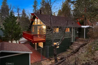 Tucked within the pines, this magical mountain cabin offers original character and peaceful living in the heart of Running Springs. Inside, rich knotty pine tongue-and-groove paneling creates an authentic cabin atmosphere, while the open living and dining area is anchored by a mid-century modern stainless steel round fireplace. Natural light pours through the windows, creating an inviting setting for cozy mountain evenings with family and friends. A playful loft above the living room offers the perfect perch to read, stargaze, or simply enjoy the view from above. The original kitchen flows easily into the main living and dining spaces, making it ideal for both relaxed daily living and weekend gatherings. Set on a generous 5,950 sqft lot with multiple cherry trees, the property offers space to garden, expand, or simply enjoy the peaceful surroundings. Multiple storage sheds provide flexibility for hobbies, workshop space, or additional storage, along with ample parking on the flat, paved driveway. Other thoughtful updates include a newer roof, newer furnace, and an updated main water shut-off valve. Ideally located within walking distance to the heart of Running Springs, local shops, restaurants, fire station, the park and the post office, with scenic hiking trails nearby and Snow Valley Mountain Resort just 8 minutes away for skiing and sledding. Conveniently situated about 90 minutes from Orange County or Los Angeles, and roughly 30 minutes to Big Bear, this property offers the perfect balance of accessibility and mountain tranquility making it an inviting full-time home, weekend retreat, or investment opportunity.