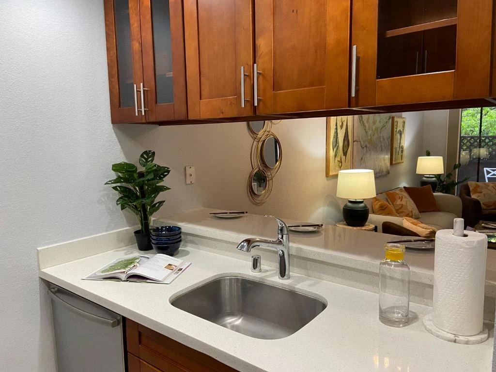 Welcome to this inviting studio retreat in the sought-after Shelter Creek community of San Bruno, where resort-style living meets everyday convenience. Lovingly maintained, this ground-floor home offers a warm, welcoming atmosphere with a true sense of home from the moment you step inside. The updated interior features granite kitchen countertops, stainless steel appliances, engineered laminate flooring, fresh paint, and an updated kitchen and bathroom. The kitchen showcases rich cherry shaker cabinetry, while the bathroom features quality tile work. A modern blue-grey palette with a curated designer accent adds style and personality throughout. Enjoy a walk-in closet with built-in organizer plus an additional entry closet for extra storage. Step out to a private patio surrounded by lush greeneryperfect for relaxing or morning coffee. The clubhouse is a short stroll away with easy access to fitness and amenities. Located in Building 3 with assigned parking space #73 in Garage 3. EV chargers nearby. Shelter Creek offers pools, tennis courts, and scenic walking paths. Close to SFO, BART, Caltrain, shopping, dining, and commute routes. HOA $537/month includes utilities, amenities, and parking.