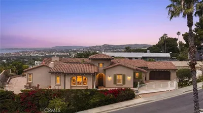 Newly built in 2007, this completely single-level 3,421 SF residence sits on an expansive 14,520 SF corner lot, offering a rare combination of scale, privacy, views, and elevated coastal living. Framed by significant ocean, harbor, island and hillside city-light views from both the front and rear, this peninsula lot is special with only one immediate neighbor. Upon arrival, a gated driveway leads to this impeccably designed Mediterranean home. Inside the formal entry welcomes you to grand spaces with high ceiling plates, coved features, and archways, and beautiful wood flooring drawing you into its captivating spaces including the formal living with direct ocean views. French doors and large-scale windows create a light-filled, open atmosphere framing the centered courtyard. Complete with an outdoor fireplace, this private outdoor space is designed for effortless, year-round entertaining at the heart of the home. The open-concept kitchen is designed for both everyday living and entertaining, complete with high-end stainless appliances, granite counters, a large island, walk-in pantry, breakfast nook, and perfect flow into the main living space. The kitchen and fire-warmed family room feature soaring vaulted ceilings with direct ocean views out toward the Catalina Island and the Dana Point Headlands. Several French doors lead to a massive wrap-around patio, very private and level. This residence offers four spacious bedrooms, each with its own ensuite bath, creating a true retreat for both residents and guests. The oversized primary suite is a sanctuary of its own, featuring a fireplace, vaulted ceilings, walk-in closet and shower, soaking tub, dual sinks, and direct access to the courtyard for a seamless indoor-outdoor experience. Additional highlights include statement lighting, crown molding, wired surround sound, custom tiling, dedicated dining and laundry rooms, several citrus trees, gated drive with major parking for oversized vehicles, 3-car garage, and a rare large-scale single-level floor plan. Ideally located in the hills just above historic downtown San Clemente, this home is walkable to Avenida del Mar’s boutique shopping and dining, the iconic San Clemente Pier, and the scenic 2.5-mile beach trail. World-class surfing, coastal trails, and Dana Point Harbor are all just minutes away—offering the ultimate Southern California lifestyle. Truly a rare opportunity at such a large-scale single-level home on a special ocean-view lot.