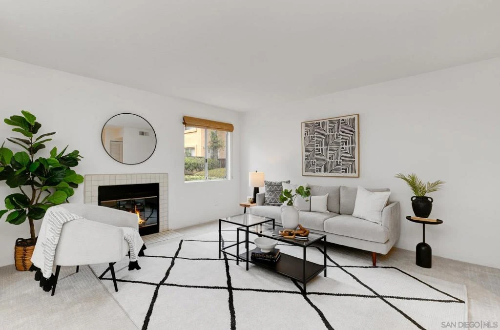 Excellent first-floor corner-unit residence in The Falls offering comfort, convenience, and move-in-ready appeal. This spacious one-bedroom home features an open floor plan with a well-appointed kitchen complete with pantry storage, plus a welcoming living room with cozy fireplace and sliding door access to a private walled-in garden patio, perfect for your morning coffee & relaxation. The upgraded bathroom includes refinished shower stall and doors & attractive wood flooring. The light-filled bedroom is generously sized and offers an ample walk-in closet. Additional highlights include a full-size stackable washer and dryer inside the unit, abundant interior storage, and a covered carport with extra storage. Ideally located in the centrally situated Falls community, residents enjoy easy access to all local conveniences including shopping, coffee houses, local dining, and easy freeway access. This lovely residence will not last so see this today before its SOLD! Ideally located in the centrally situated Falls community, residents enjoy easy access to shopping, coffee houses, local dining, and nearby freeways. HOA fees are LOW and amenities include 2 community pools, BBQ area, spa, Rec room area, small workout facility and tennis courts. A wonderful opportunity to own a well-maintained home in a highly convenient San Diego location. See it before its sold!