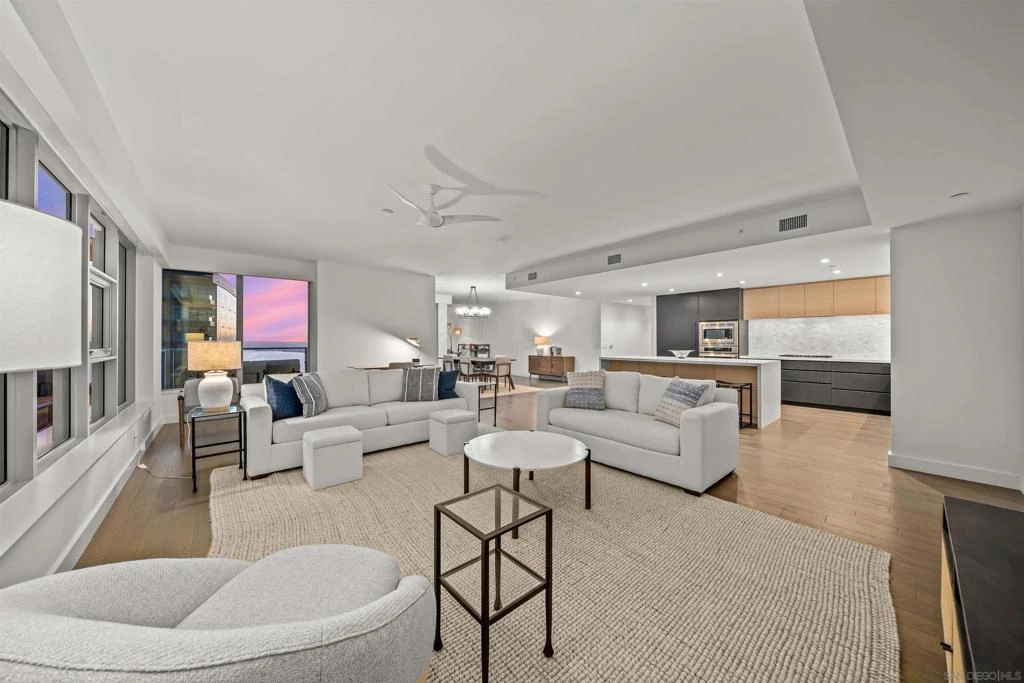 Welcome to Residence 3205, the largest and most sought-after floorplan at Savina, Downtown San Diego’s newest luxury high-rise. One of only two residences in the building with this layout, 3205 offers a truly rare opportunity and showcases sweeping southwest-facing views of the bay, city skyline, and vibrant sunsets from every room. This spacious 2-bedroom plus den, 2.5-bath home features two private balconies - one off the living room and another off the primary suite - creating a seamless connection between indoor and outdoor living. The expansive great room is ideal for entertaining or simply enjoying the panoramic views. Both bedrooms include en-suite bathrooms and large walk-in closets, while the versatile den can be enclosed to create a third bedroom or private office. A dedicated dining area adds flexibility and functionality to the open-concept layout. Additional upgrades include Lutron motorized shades throughout, with blackout and solar options in the bedrooms for added comfort and privacy. Savina offers one of Downtown’s most extensive amenity collections, including a 24-hour concierge, heated pool and spa, state-of-the-art fitness center, social lounge, business center, conference room, pet retreat, bike storage and repair station and EV charging stations - just steps from the waterfront and Little Italy.