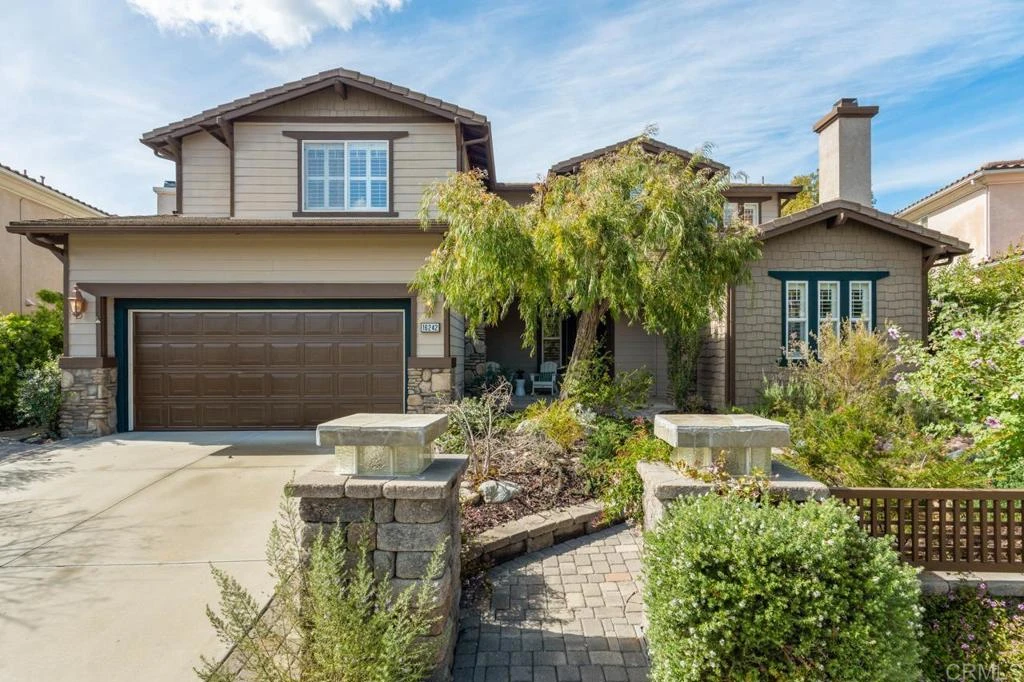 Welcome to 4S Ranch! This gorgeous Craftsman-style home sits on an extremely private, elevated cul-de-sac lot with canyon and hill views — a rare setting in the community. The Craftsman exterior, with its classic large porch, is complemented by beautiful stone and paver hardscaping, drought-tolerant plants, and mature, lush landscaping for exceptional curb appeal and privacy. Inside, the grand foyer features soaring 20-foot ceilings and a curved staircase, opening to formal living and dining spaces with a fireplace and charming architectural details. The open-concept great room includes a kitchen with large serving island and walk-in pantry, casual dining area, and spacious family room with a second fireplace — ideal for everyday living and entertaining. Enjoy serene backyard views with no homes behind. Upstairs offers a bonus room, three bedrooms, and a spacious primary suite with walk-in closet, separate soaking tub and shower, and a glass door to a private deck with western mountain and sunset views. Upgrades include new copper plumbing and water heater in 2023, fresh interior paint, plantation shutters throughout, and a whole-house fan. Ample storage includes an oversized laundry room and a three-car tandem garage with space for storage, gym, or workshop. Enjoy 4S Ranch living with top-rated Poway Unified schools, five community parks (including gated splash park), trails, events, and youth sports, plus optional Boys & Girls Club pool day passes or memberships. Close to shopping, dining, gyms, tech hubs, downtown San Diego (25 miles), and Torrey Pines/Del Mar beaches (15 minutes).