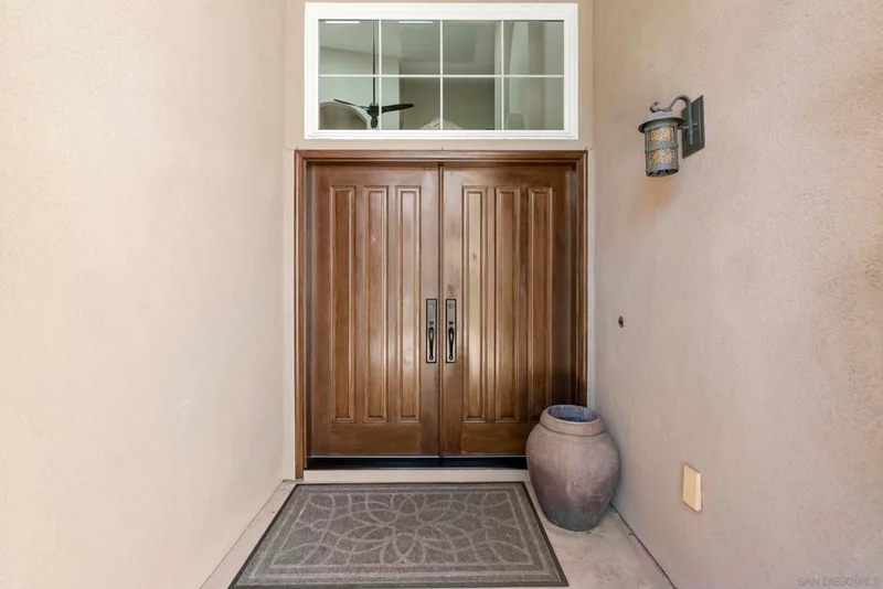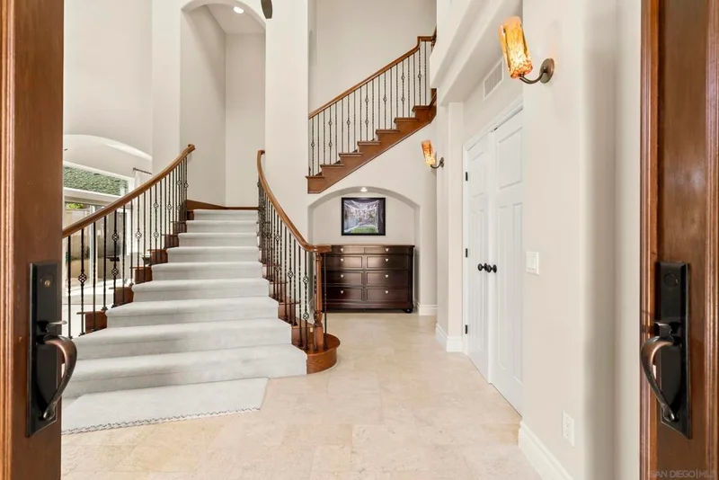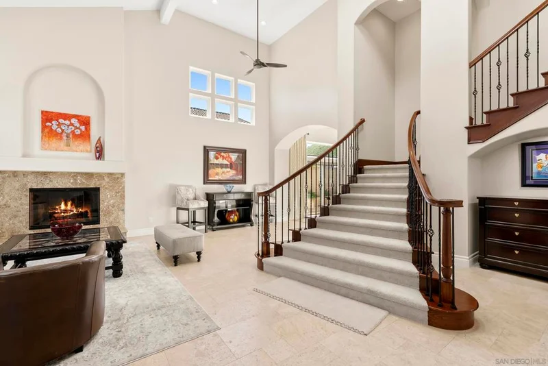 Discover this stunning home in the sought-after Montelena community of Rancho Bernardo, offering nearly 3,000 square feet of thoughtfully designed living space. Featuring 4 bedrooms and 2.5 baths, this residence blends timeless architectural details with bright, open interiors and breathtaking westerly sunset views. Step through the impressive solid wood front door into a dramatic entry highlighted by soaring ceilings and a sweeping staircase. Gorgeous travertine flooring spans the main level, while large windows and multiple skylights fill the home with natural light. The formal living room, warmed by a cozy fireplace, flows effortlessly into the formal dining room, which is highlighted by a tray ceiling—perfect for everything from intimate dinners to festive gatherings. The chef’s kitchen is a true showstopper, boasting quartz countertops, custom cabinetry, double ovens, a five-burner gas stove, a walk-in pantry, and a large bay window with deep counters framing beautiful sunset views. With bar seating and an open layout connecting to both the formal dining room and the inviting family room—complete with its own fireplace—this home is designed for effortless entertaining and everyday living. Upstairs, the spacious primary suite with phenomenal westerly views is a serene retreat featuring vaulted ceilings and multiple windows that fill the room with natural light. The spa-like ensuite bath includes dual vanities, a soaking tub, walk-in shower, and two closets—one walk-in. A secondary bedroom currently serves as a private sitting room adjacent to the primary suite. Two additional generously sized bedrooms and a full bathroom complete the upper level. The backyard patio offers breathtaking sunset views and is perfect for entertaining, featuring a large patio area, built-in BBQ, and plenty of space to relax under the evening sky. Elegant touches such as alabaster sconces, oil-rubbed bronze Baldwin hardware, arched doorways, and wide hallways add character and charm throughout. Residents enjoy membership to the RB Swim & Tennis Club with outstanding amenities including swimming pools, tennis, basketball, racquetball, and pickleball courts, fitness center, sauna, hot tub, playground, wood shop, game room, library, and more. Ideally located near Rancho Bernardo Inn, Bernardo Winery, and Lake Hodges, this home offers an exceptional lifestyle in one of North County’s most desirable communities.