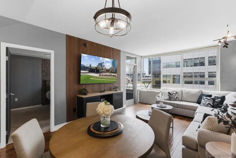 This beautifully remodeled, west-facing residence boasts a private balcony with coveted views into iconic Petco Park—home of the San Diego Padres—where the excitement of game day becomes part of your everyday backdrop. Exposed brick accent walls in the living room and bedroom create warmth and architectural character throughout the space. The kitchen features brand new custom cabinetry with soft-close drawers paired with quartz countertops and stainless steel appliances, creating a sleek, modern feel. The newly remodeled bathroom features a pedestal vanity and ceramic tile from Floor & Decor installed throughout the shower, pony walls, and flooring. ICON offers an impressive array of upscale amenities: 24/7 concierge service, a well-equipped fitness center, a rooftop SKYBOX lounge, a theater room, and a community work area/lounge, all complemented by a beautifully landscaped courtyard featuring striking art installations. Residents enjoy exceptional walkability, with FIT Athletic Club—San Diego’s premier fitness club—located directly across the street. From world-class dining and entertainment to waterfront walks and ballpark energy, the very best of Downtown San Diego is right outside your door. The Ballpark District spans 22 blocks surrounding Petco Park, where the Padres-affiliated Ballpark District Community Partnership provides daily clean-up services to maintain the area.