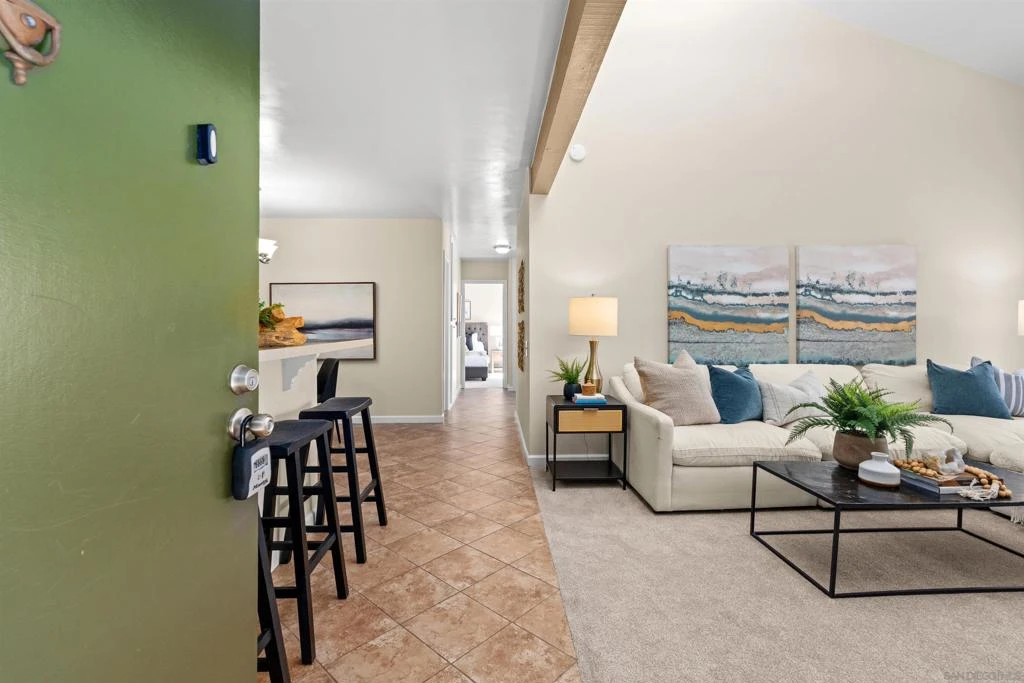 Tons of natural light stram into this terrific top floor Serra Mesa condo. The unit features vaulted ceilings in the living room, tons of storage w/ 3 interior hall closets & a 4th on the balcony, a spacious master bedroom w/ a huge closet & a nice wall AC unit for those warm Summer days. Among the many upgrades are fresh paint, new carpet, newer glass shower doors & updated light fixtures. The kitchen features an open concept & solid surface counter tops. There's even two assigned parking spots! Please see supplement for more. Welcome home! The complex amenities include a wonderful pool area complete with spa and kiddie pool, a rec room w/ a pool & ping pong table, BBQ area & a large fenced in dog run.