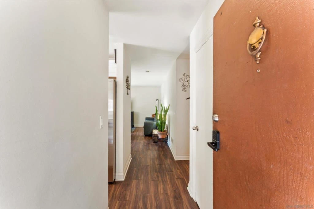 Welcome to this updated 2 bed, 2 bath first-floor condo offering nearly 1,200 sq ft of comfortable, open living. Features include LVP flooring, quartz counters, and a well-appointed kitchen with stainless appliances and an in-unit washer/dryer combo. Security cameras included. Assigned parking with potential for a second space (HOA). Enjoy a private patio overlooking a green canyon for added privacy. Community amenities include a pool, spa, and clubhouse, all conveniently located near SDSU, trolley access, shopping, and dining.