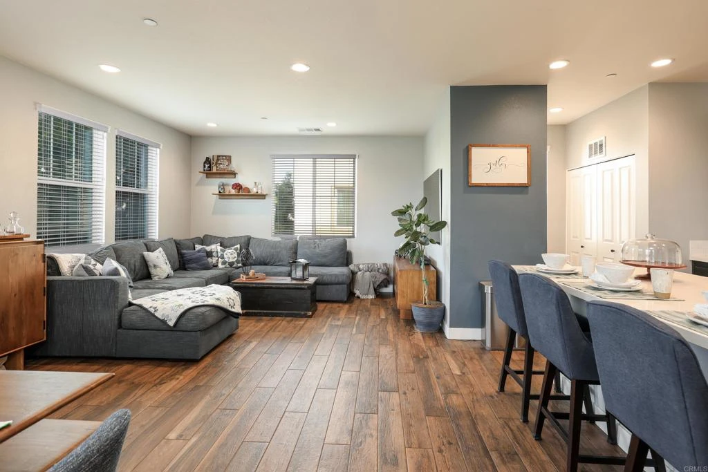 Beautiful 3-story townhome offering 4 bedrooms, 3.5 bathrooms, and 1,829 sq ft of thoughtfully designed living space. This modern home combines smart home technology, stylish upgrades, and a functional layout perfect for today’s lifestyle. The first floor features a private bedroom with a full bathroom ideal for guests, extended family, or a home office. The second level showcases an open-concept living space with a spacious living room, dining area, and balcony that brings in natural light and fresh air. The stunning kitchen is designed for both everyday living and entertaining, featuring GE Café Smart Appliances, a large center island, pantry, smart kitchen faucet, and beautiful wood-look tile flooring throughout. A half bath and laundry area are also conveniently located on this level. The third floor hosts the primary suite, complete with an en-suite bathroom and walk-in closet, along with two additional bedrooms and another full bathroom. Additional highlights include a gated front yard with low-maintenance turf, ceiling fans, smart LED lighting, Nest thermostat, Ring doorbell, and a 2-car attached garage with a 220 outlet. Residents enjoy a well-maintained community featuring two pools, playgrounds, and lush landscaping all conveniently located near major freeways for easy commuting. Sellers may consider a VA assumption for another VA buyer.
